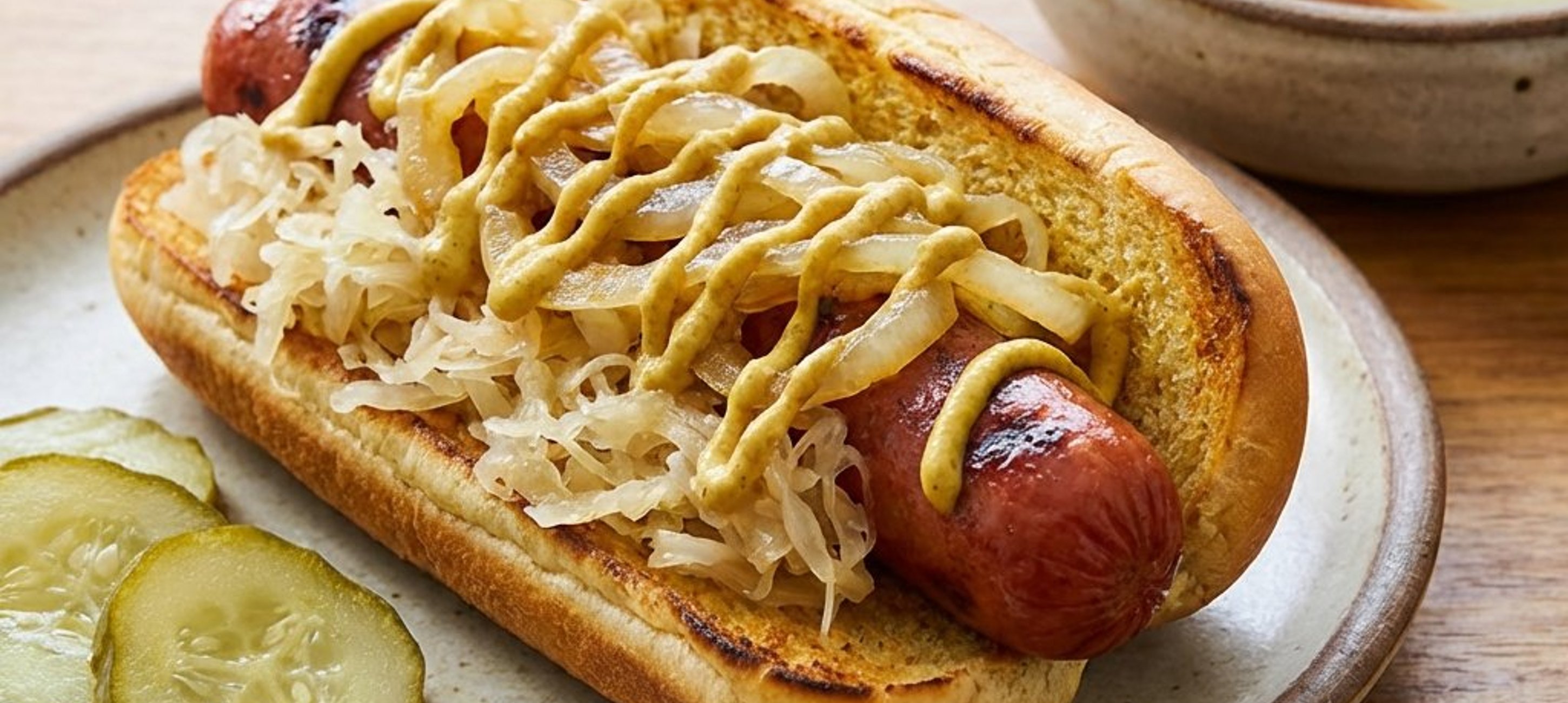 - 6Die fertigen Würstchen in die Brötchen legen. Die Zwiebel-Sauerkraut-Mischung großzügig darauf verteilen. Nach Geschmack Senf und in Scheiben geschnittene Gewürzgurken hinzufügen.