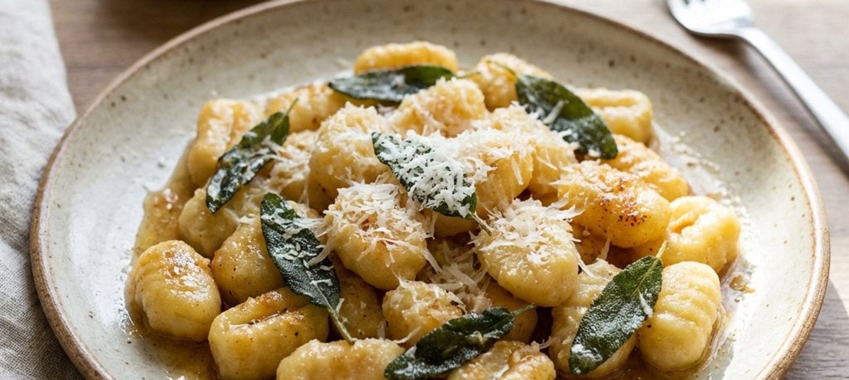 Servieren Sie die Gnocchi auf vorgewärmten Tellern, damit die Salbeibutter schön flüssig bleibt. Ein Glas trockener Weißwein passt hervorragend dazu.