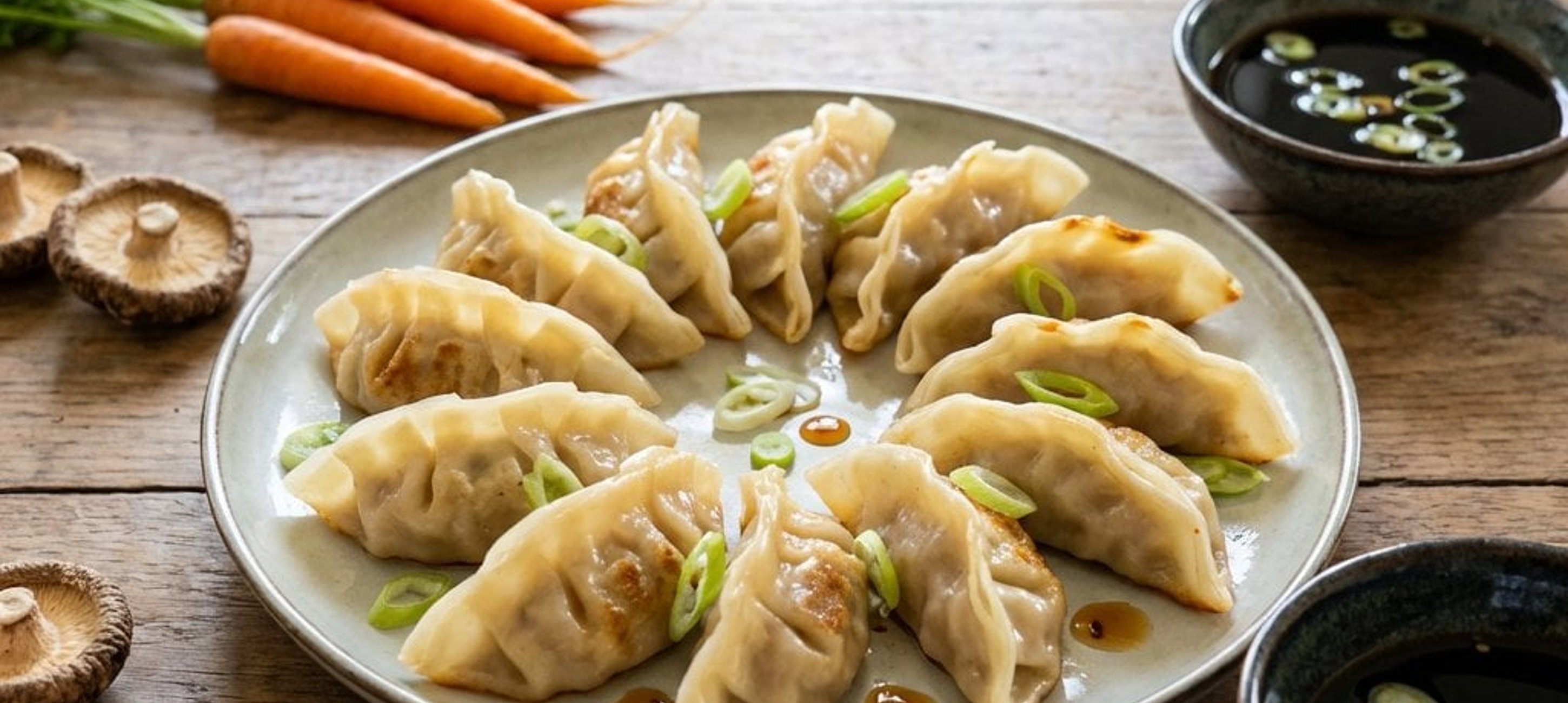 Servieren Sie die Gyoza mit einem klassischen Dip aus Sojasauce, Reisessig und einem Tropfen Chiliöl für die perfekte Balance.