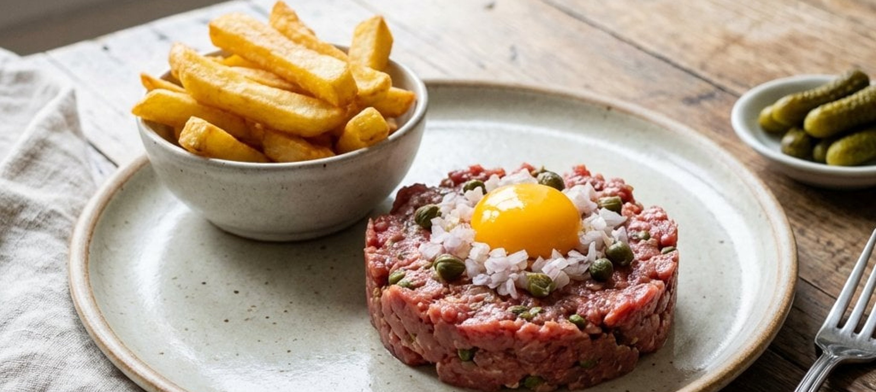 Servieren Sie das Tatar klassisch mit einer kleinen Mulde in der Mitte, in die Sie ein frisches Eigelb setzen können. Ein kühles belgisches Bier passt hervorragend dazu.