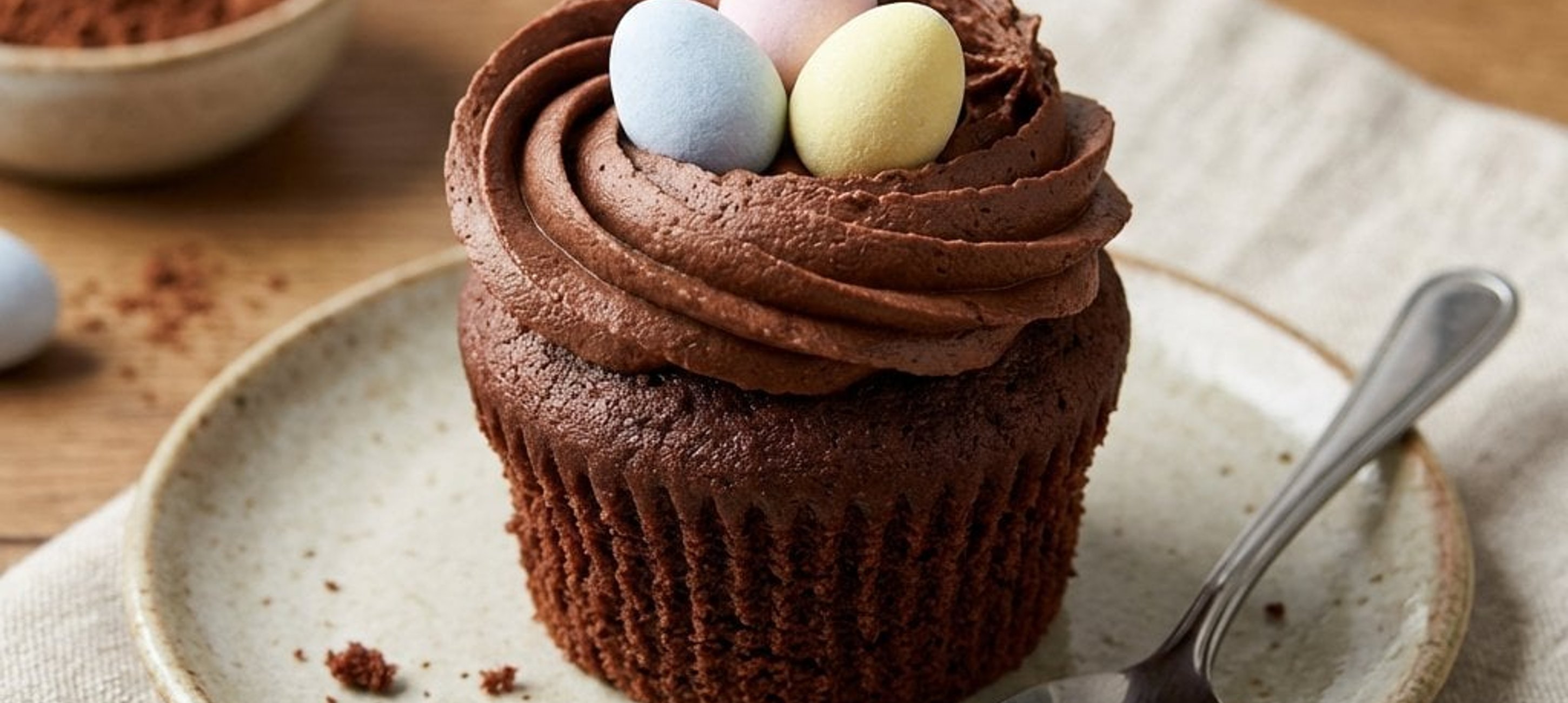 - 10Die Creme in einen Spritzbeutel füllen und kreisförmig auf die Cupcakes spritzen, sodass die Form eines kleinen Nestes entsteht. Mit den Schokoladeneiern dekorieren.