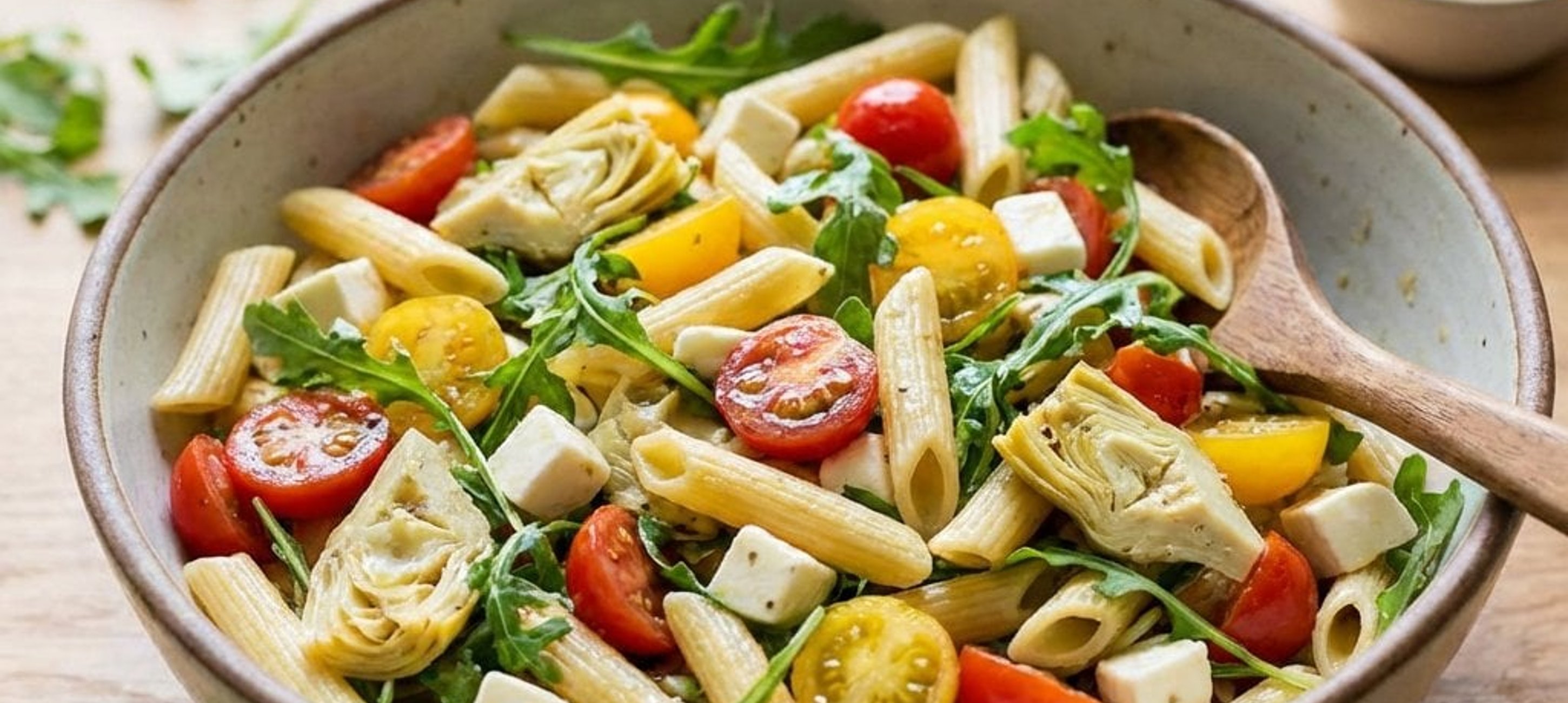 - 3Alle vorbereiteten Zutaten (außer dem Rucola) in einer großen Schüssel vorsichtig vermengen.