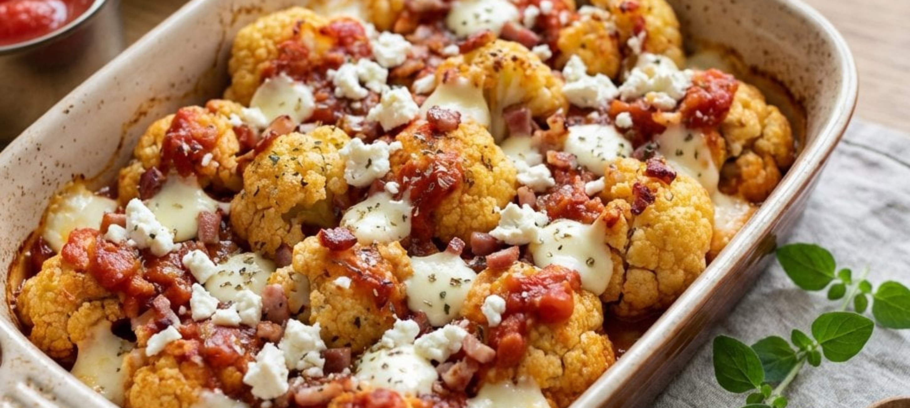 - 5Die Blumenkohlmischung zum ausgelassenen Speck in die Auflaufform geben, gut vermischen und bei 220–225 °C für 16–17 Minuten backen.
