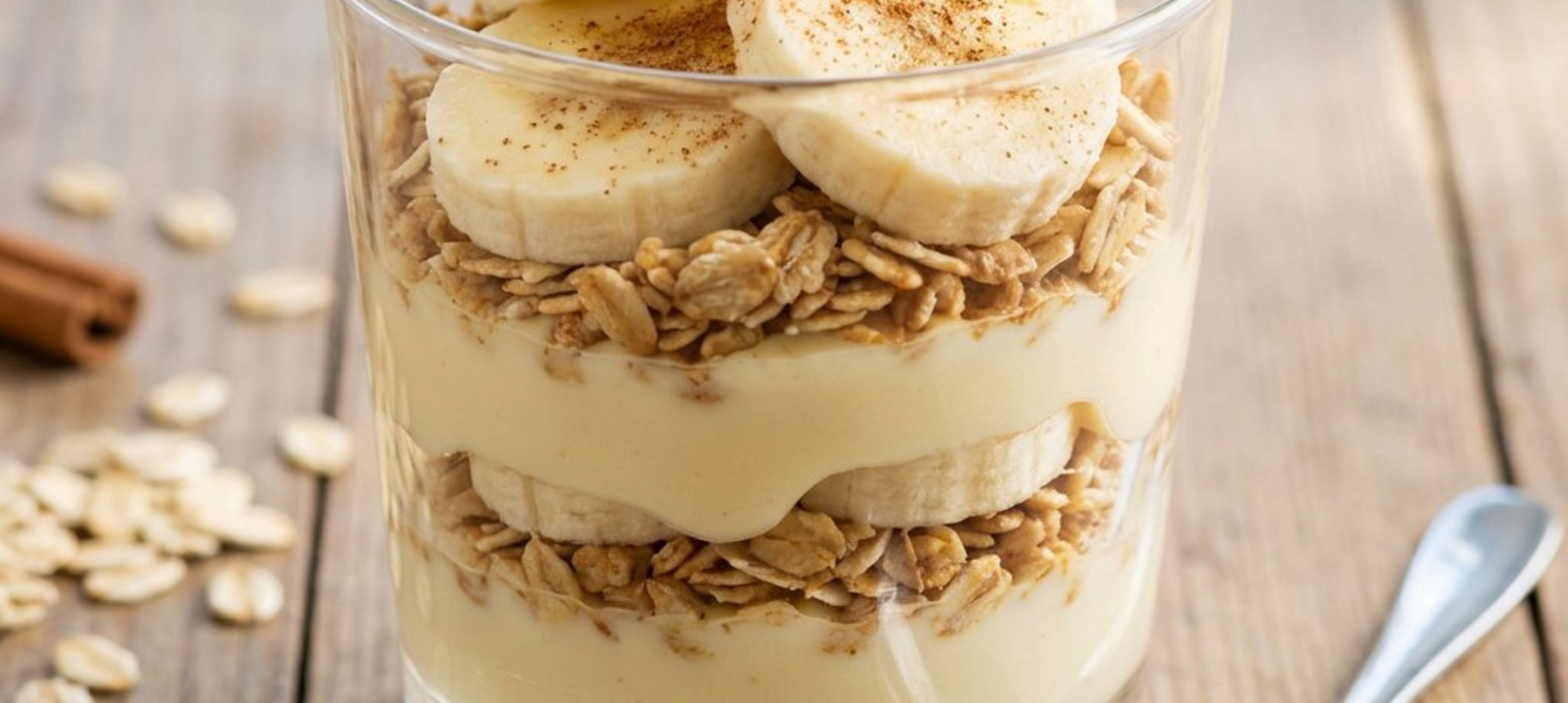 - 1Den abgekühlten Pudding aus dem Kühlschrank nehmen, die Folie entfernen und nochmals kurz mit dem Schneebesen aufschlagen. Die Hälfte der Puddingcreme in die Gläser auf die Haferflockenschicht geben. Darauf die Hälfte der Bananenscheiben verteilen. Den restlichen Pudding darübergeben und mit den restlichen Bananenscheiben abschließen. Das Parfait für mindestens 30 Minuten kalt stellen oder direkt genießen. Vor dem Servieren nach Belieben mit etwas Zimt bestreuen.