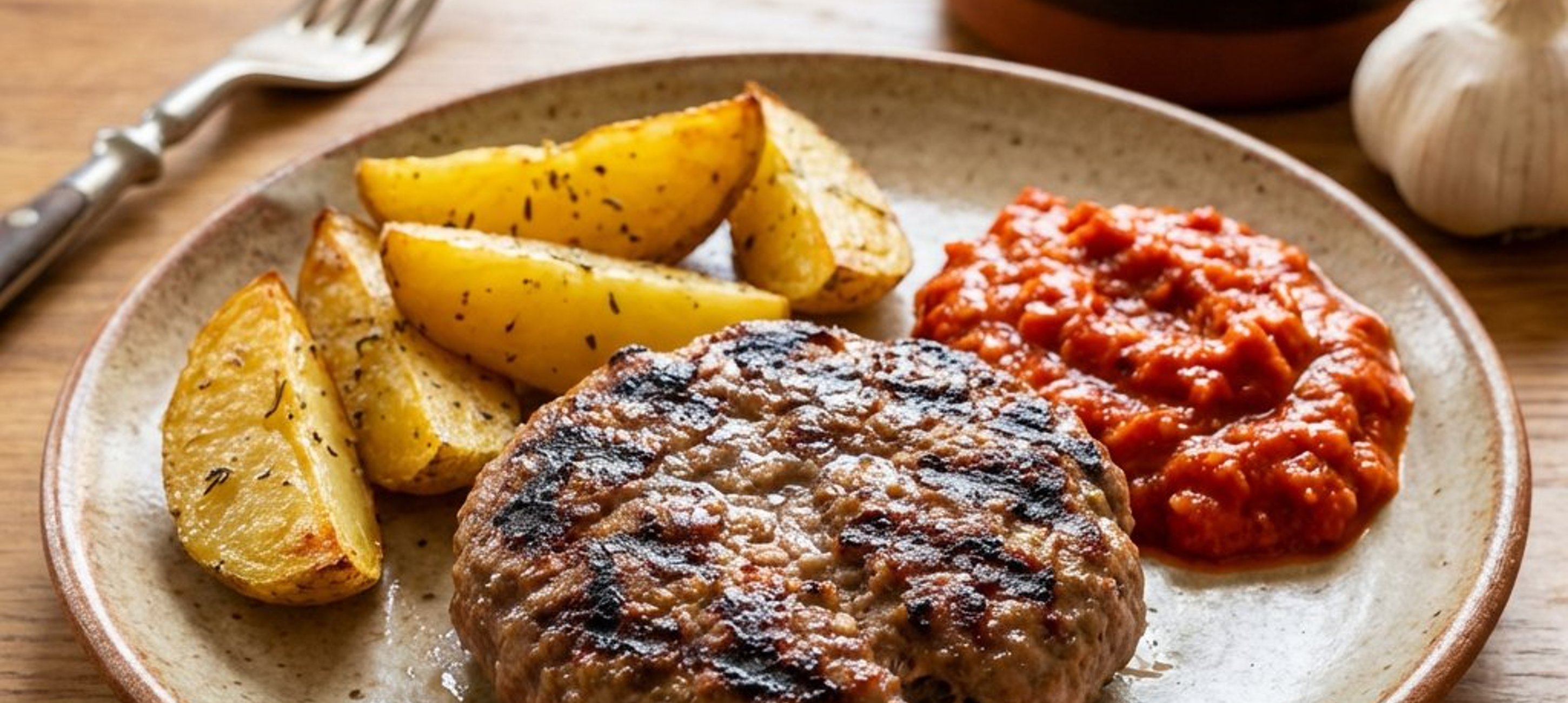 - 3Die fertigen Pljeskavica zusammen mit den Röstkartoffeln und einem großzügigen Klecks Ajvar servieren.