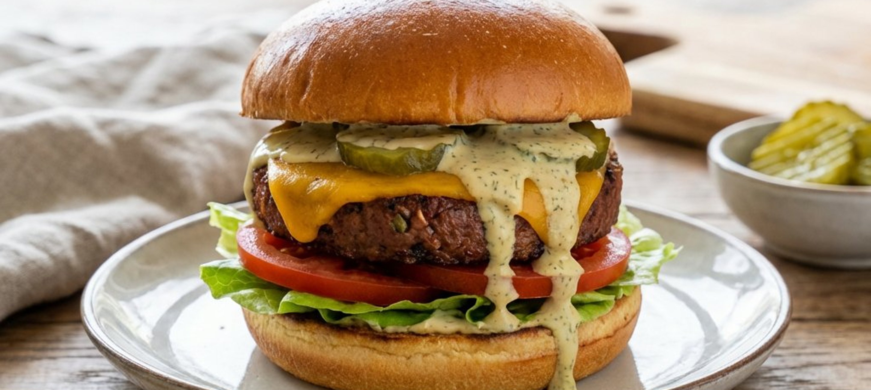 - 2Die Burgerbrötchen halbieren und die Schnittflächen kurz anrösten. Die Unterseiten mit Ketchup bestreichen. Mit Salatblättern und Tomatenscheiben belegen. Darauf das Patty mit dem geschmolzenen Käse platzieren. Mit Gurkenscheiben, fein gehackten Zwiebeln and einem großzügigen Löffel des Senf-Dill-Dressings toppen. Die obere Brötchenhälfte aufsetzen und servieren. Guten Appetit!