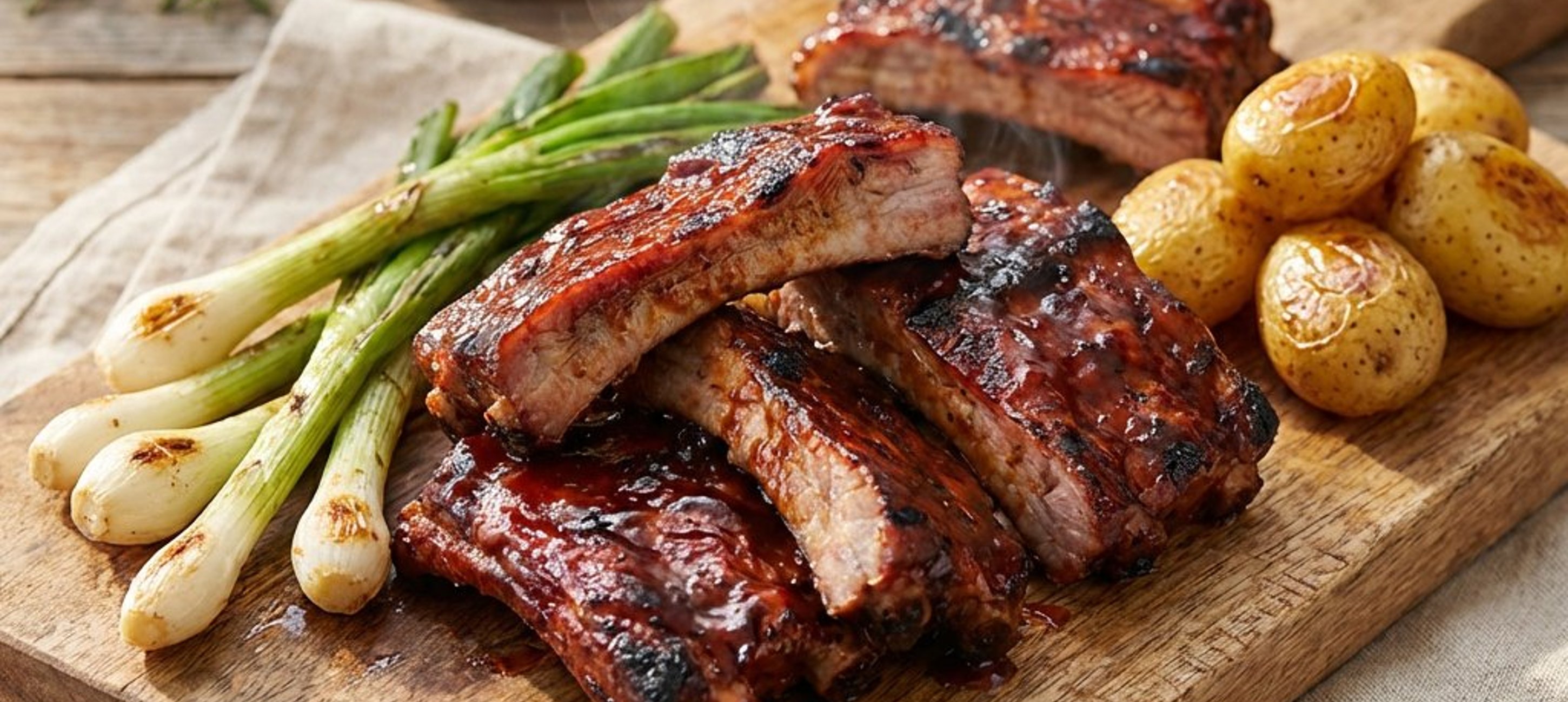 - 3Die Rippchen zusammen mit den gegrillten Frühlingszwiebeln und den Röstkartoffeln servieren. Guten Appetit!