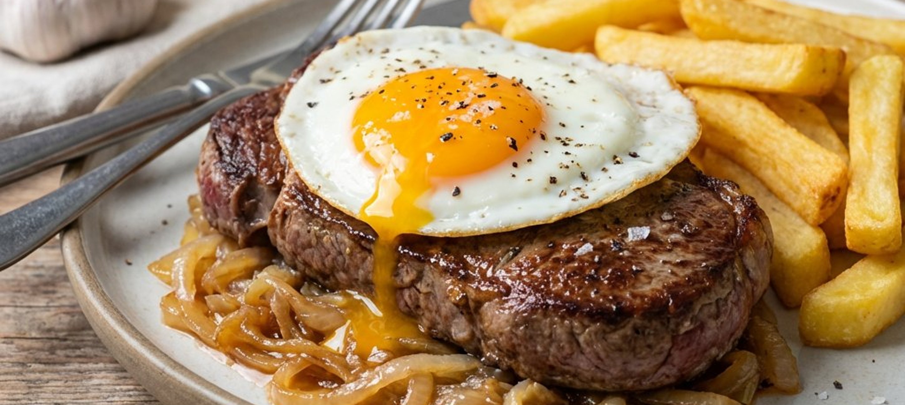 - 6Etwas Öl in die Pfanne geben und die Eier als Spiegeleier braten. Nach Belieben mit Salz und Pfeffer würzen. Die Pommes, das Steak mit Zwiebeln und das Spiegelei auf Tellern anrichten und sofort servieren.