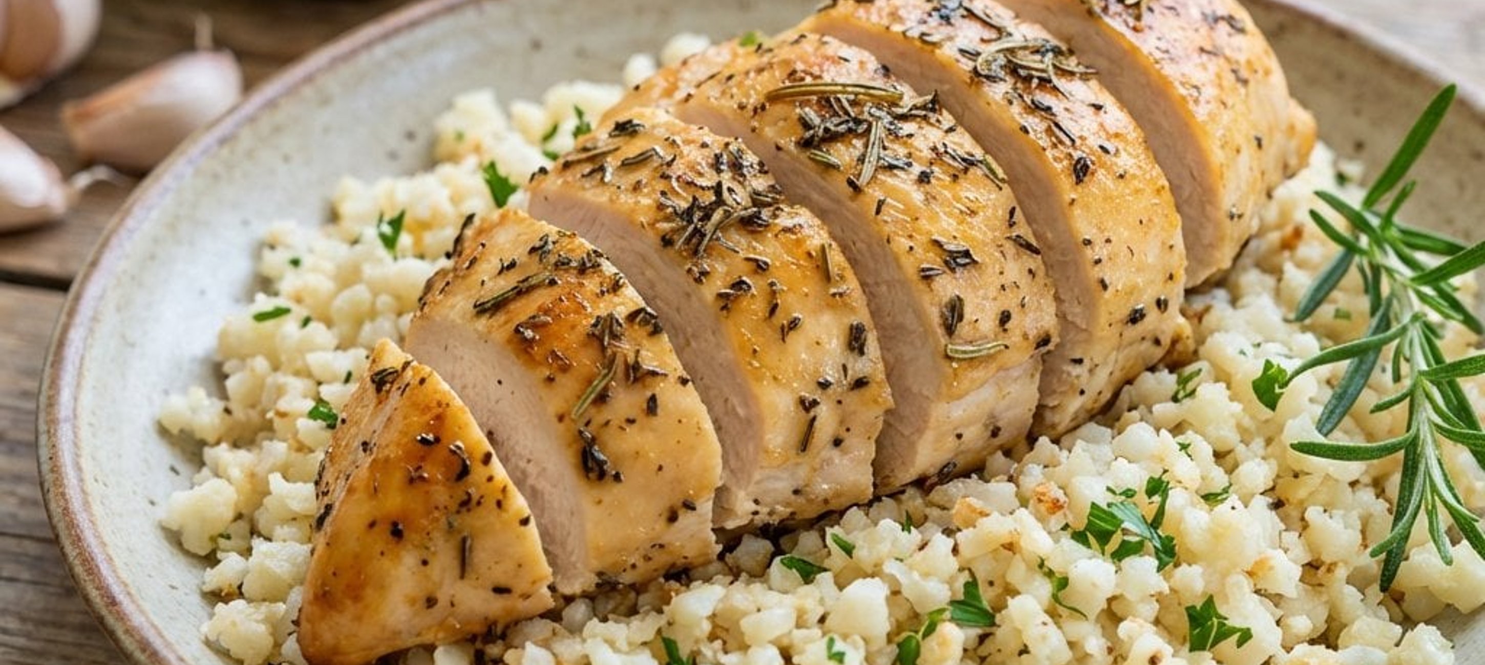 - 4Die Hähnchenbrustfilets waschen, trocken tupfen und in eine Schüssel geben. Mit Thymian, Rosmarin, Salz und Pfeffer würzen und gut vermengen. Das gewürzte Fleisch auf das Blumenkohlbett in der Auflaufform legen. Im vorgeheizten Ofen bei 190–195 °C für 27–30 Minuten backen.