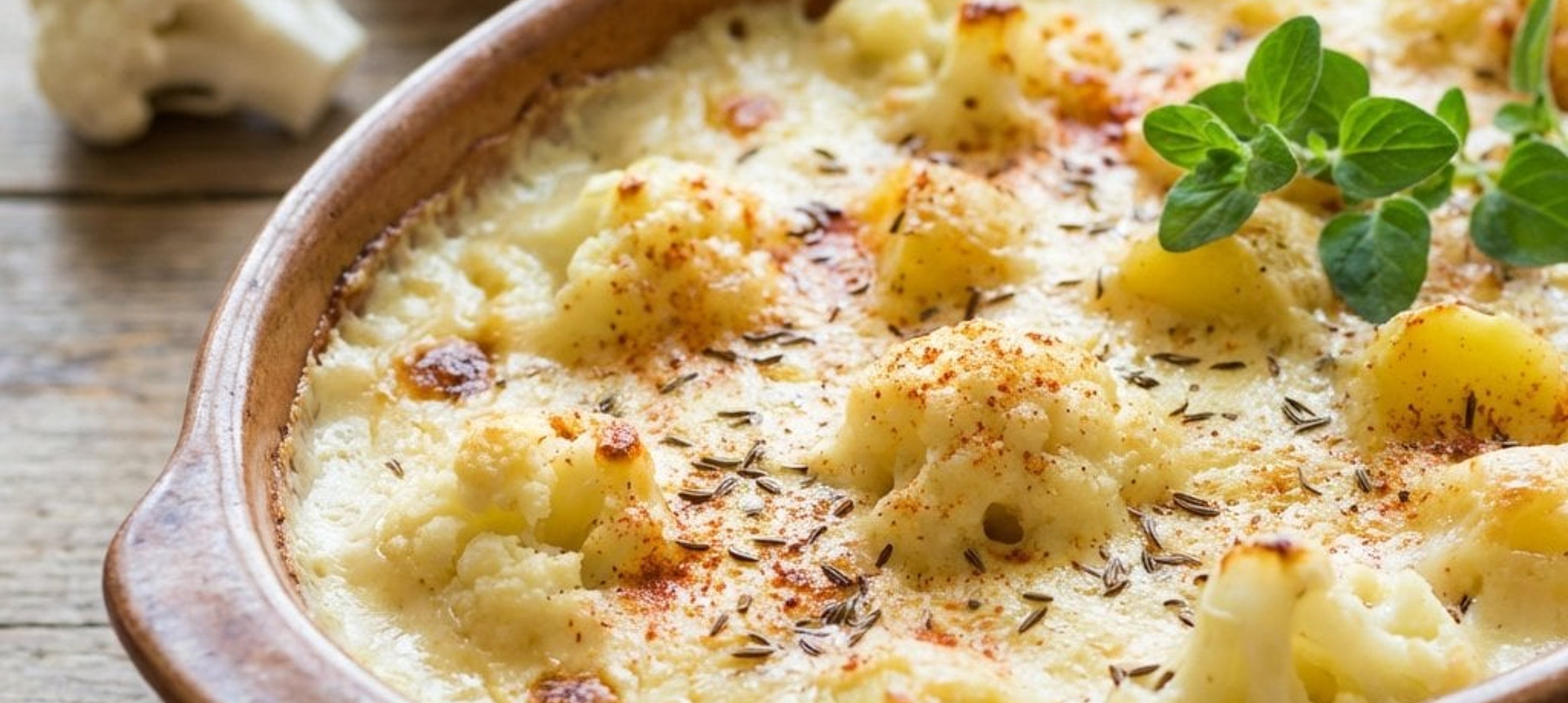 - 4Die pürierte Mischung in die Auflaufform geben. Die restlichen Blumenkohlröschen und Kartoffelwürfel hinzufügen und alles gut vermengen. Im vorgeheizten Ofen bei 195–200 °C für ca. 35–40 Minuten backen.