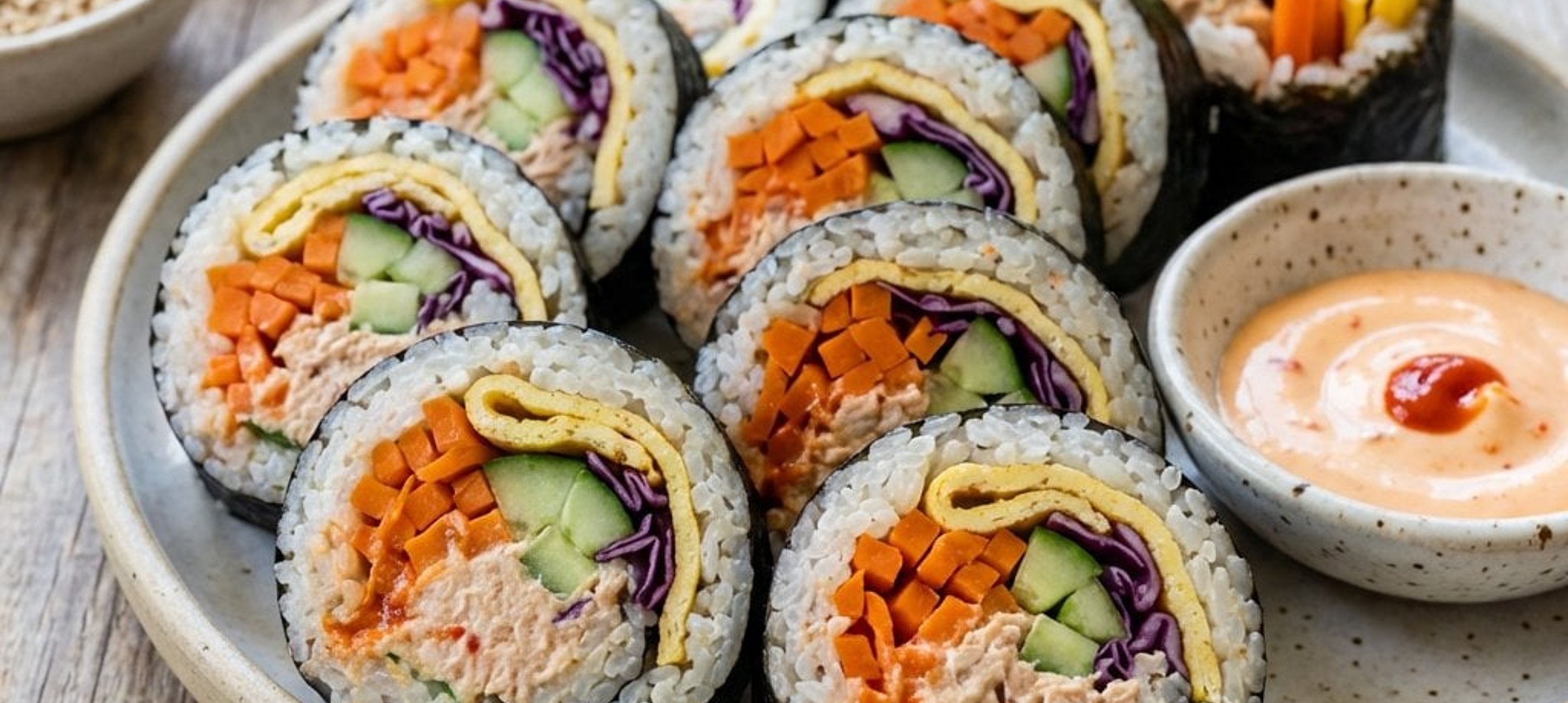 - 3Zum Rollen ein Nori-Blatt mit der rauen Seite nach oben auf eine Bambusmatte legen. Den abgekühlten Reis mit feuchten Fingern gleichmäßig darauf verteilen, dabei am oberen Rand einen ca. 1 cm breiten Streifen frei lassen. Den Reis leicht andrücken. Am unteren Rand die Thunfisch-Mischung, Karotten, Rotkohl, Gurken und Omelett-Streifen schichten. Den freien Nori-Rand leicht mit Wasser befeuchten.