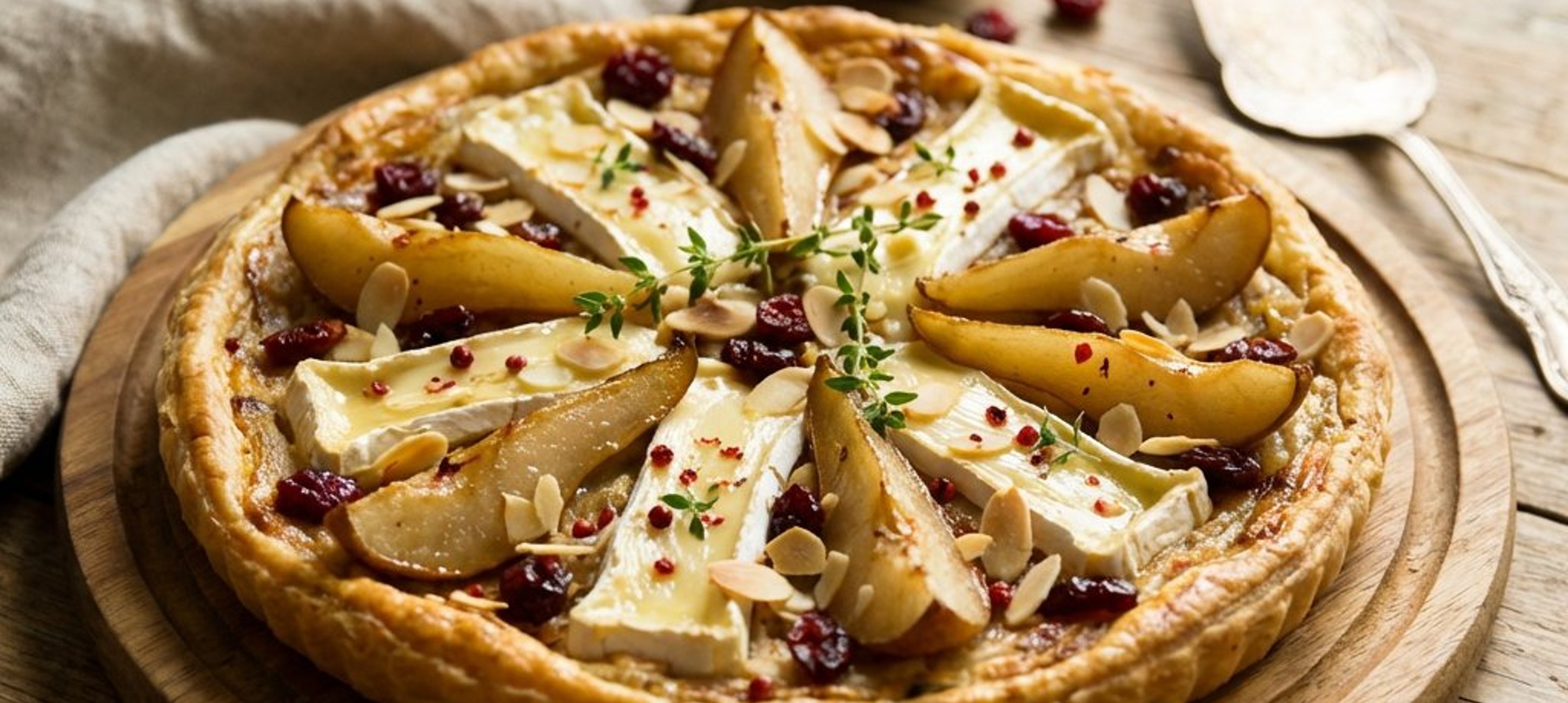 - 3Den Camembert in dünne Scheiben schneiden. Die Birnen waschen, entkernen und ebenfalls in feine Spalten schneiden. Nun das Innere des Teigs abwechselnd mit Käse- und Birnenscheiben belegen. Sobald die Fläche gefüllt ist, alles mit Ahornsirup beträufeln. Mit zerstoßenem rosa Pfeffer, getrockneten Cranberries und Mandelblättchen bestreuen.