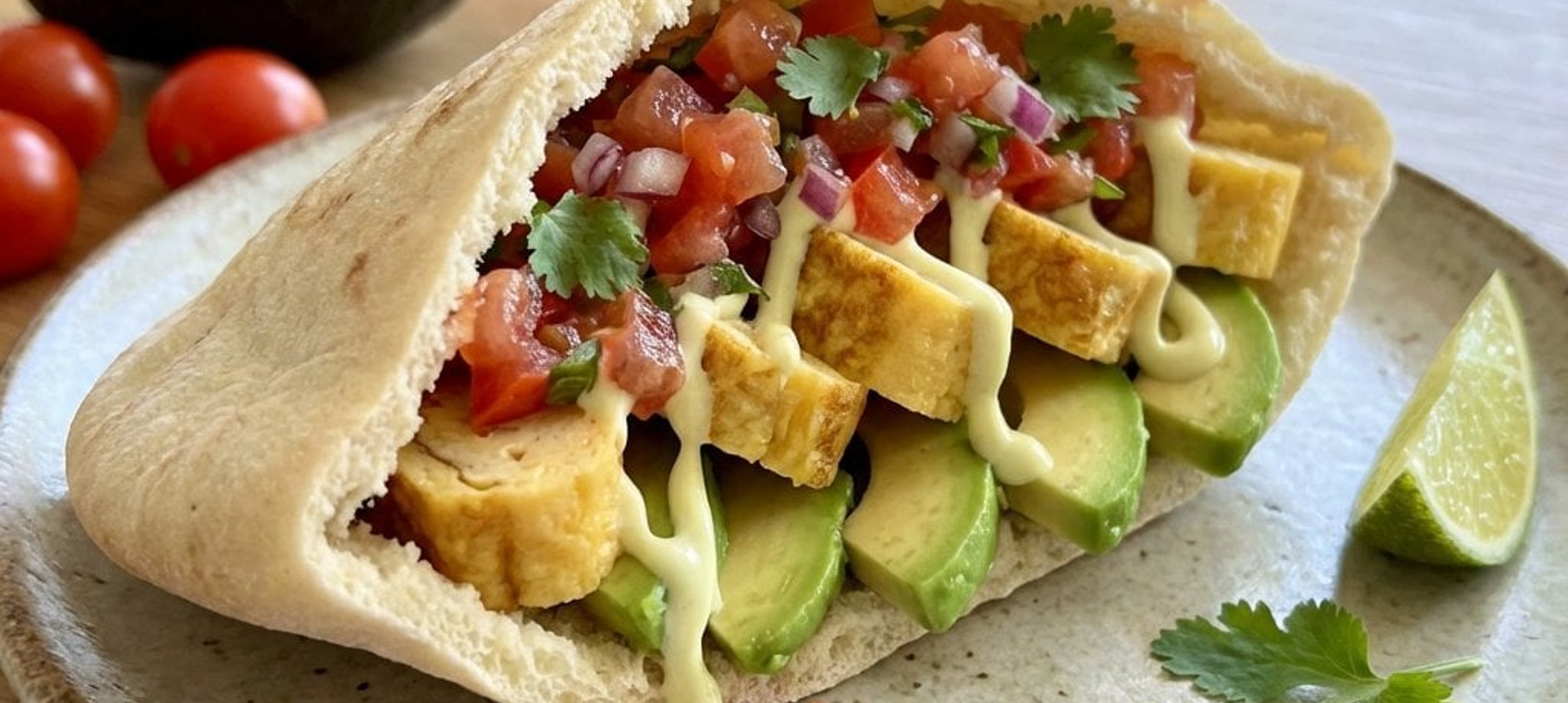 - 1Den Ofen auf 230 °C vorheizen. Die Pitabrote leicht mit Wasser beträufeln und auf einem mit Backpapier ausgelegten Backblech ca. 5 Minuten aufbacken. Danach ein Stück vom Rand abschneiden, um eine Tasche zu bilden. Das noch heiße Pitabrot zuerst mit dem geriebenen Käse auslegen, damit dieser schmilzt. Anschließend mit den Omelettstreifen, Avocadoscheiben und der Tomatensalsa füllen. Mit der Limetten-Mayonnaise beträufeln und sofort servieren.