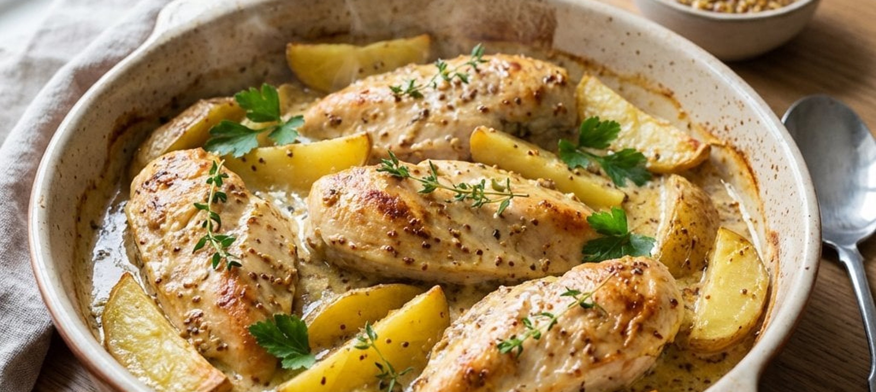 - 3In der Auflaufform Sahne, Hühnerbrühe, Thymian, Rosmarin, 2 EL Rapsöl und den Dijon-Senf gut miteinander verrühren. Die Kartoffelviertel in die Sauce geben und alles vermengen. Im vorgeheizten Ofen ca. 35–40 Minuten backen.