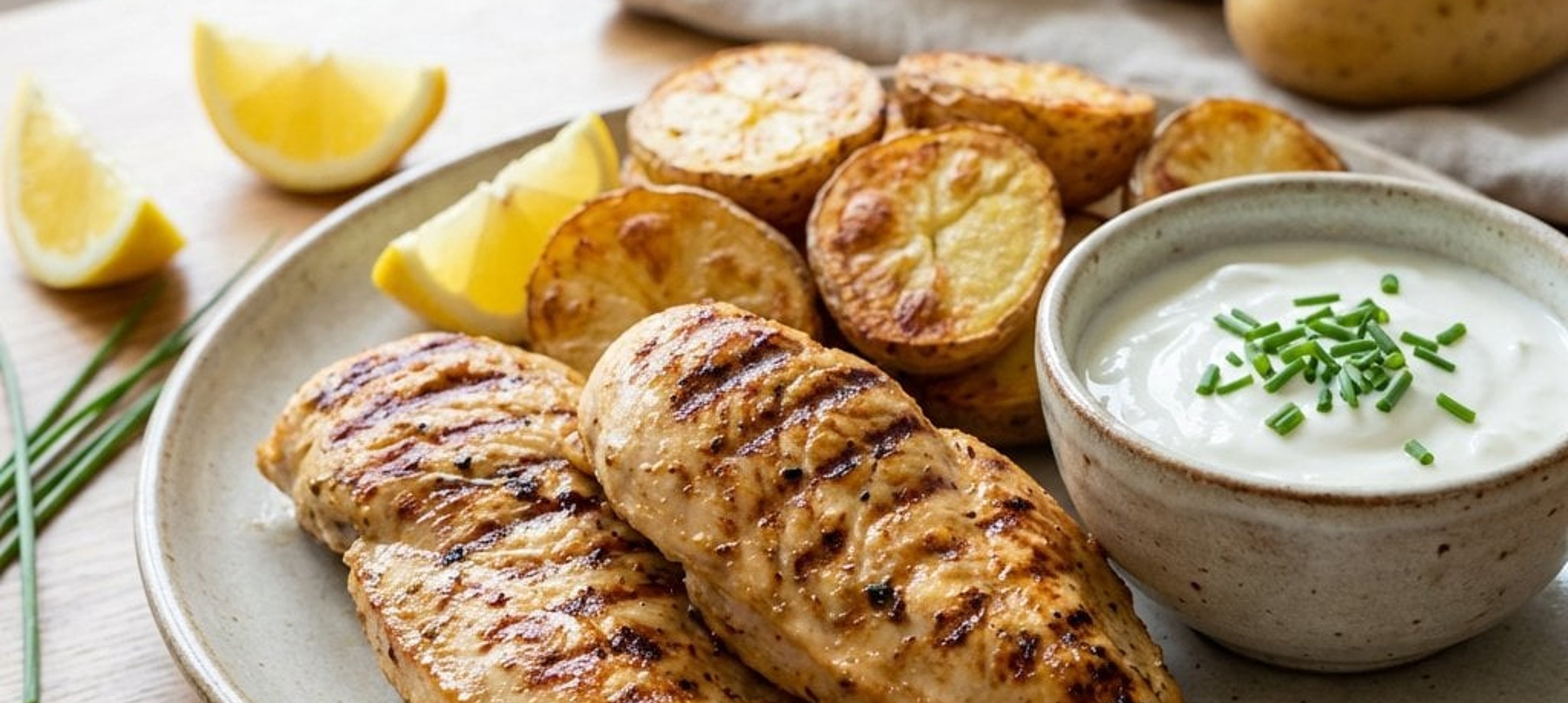 - 6Das gegrillte Hähnchen zusammen mit den heißen Ofenkartoffeln und dem frischen Joghurt-Dip servieren. Guten Appetit!