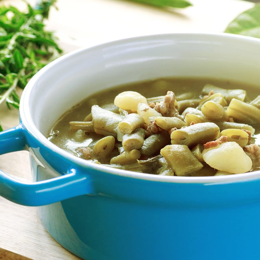 - 2Danach die Bohnen und Kartoffeln hinzugeben und alles mit Brühe aufgießen, bis der Eintopf komplett bedeckt ist. Danach die Mettenden in die Brühe geben und alles 15 bis 20 Minuten bei geringer Hitze köcheln lassen. Den Eintopf anschließend mit Salz und Pfeffer abschmecken.