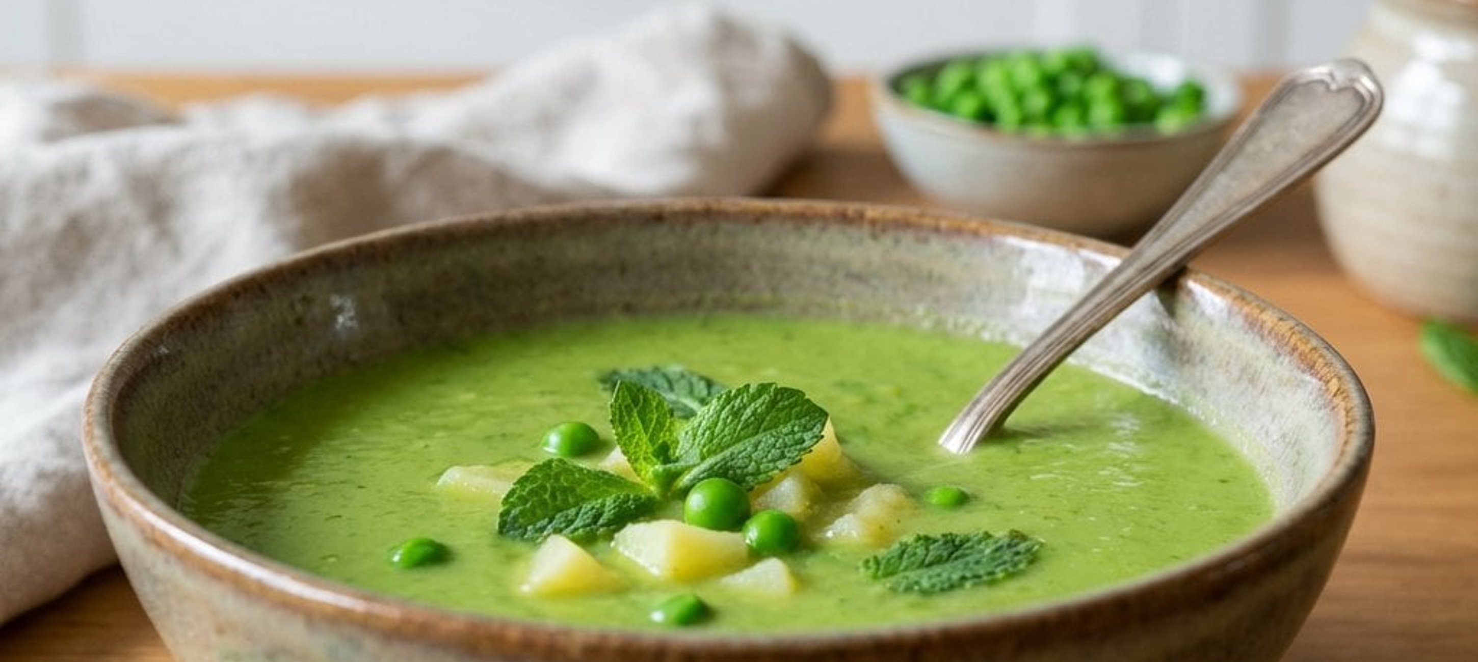 - 4Etwa die Hälfte der gekochten Kartoffelwürfel mit einer Schaumkelle aus dem Topf nehmen und beiseitelegen. Nun 300 g der gefrorenen Erbsen, die frische Minze und die Milch in den Topf geben. Alles ohne Deckel weitere 3–4 Minuten bei mittlerer Hitze köcheln lassen.