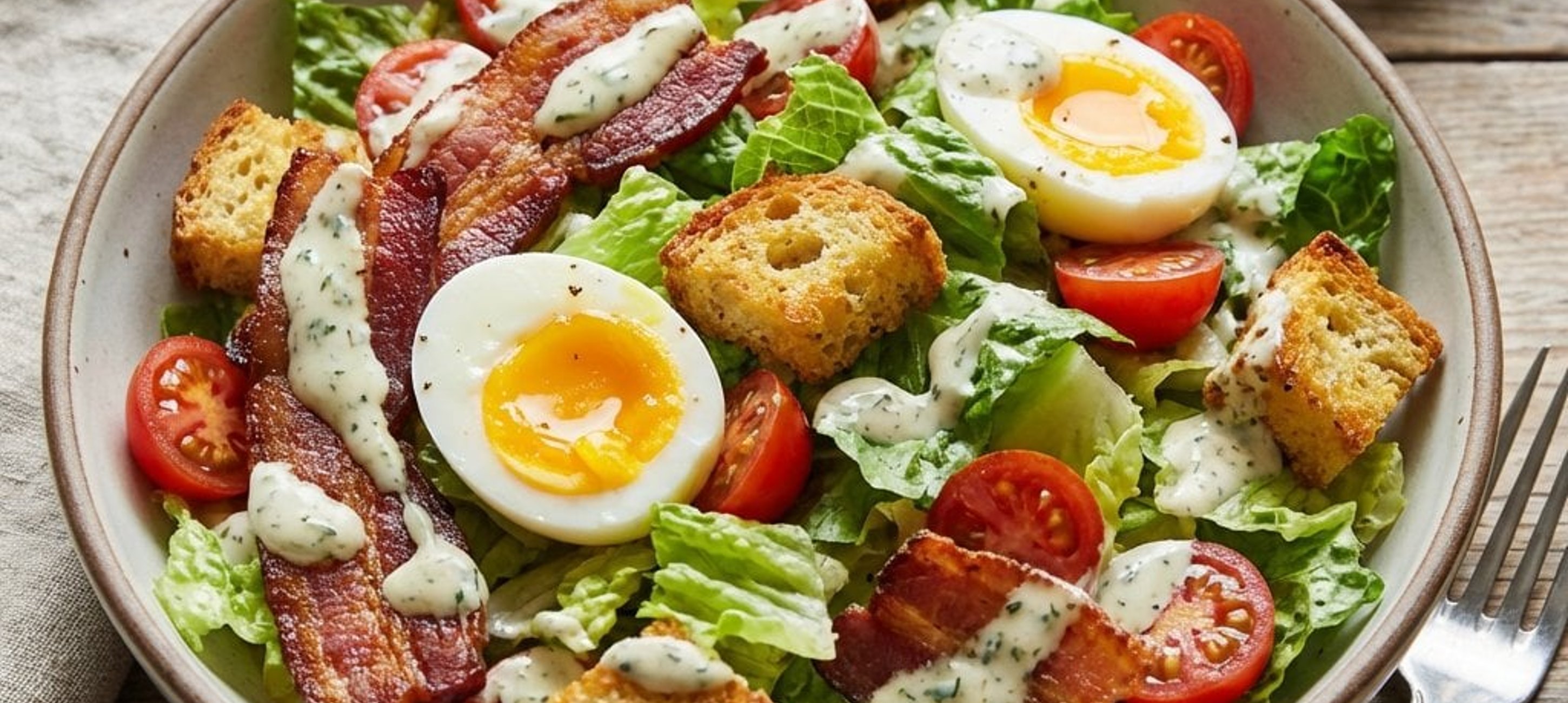 - 2Den Römersalat waschen, trocken schleudern und in Streifen schneiden. Die Tomaten waschen und würfeln. Den Schnittlauch fein hacken. Für das Dressing Mayonnaise und Zitronensaft glatt rühren. Den Salat mit Tomaten, Croutons, zerbröseltem Speck und dem Dressing vermengen. Die Eier halbieren und auf dem Salat anrichten. Mit Schnittlauch bestreut servieren.