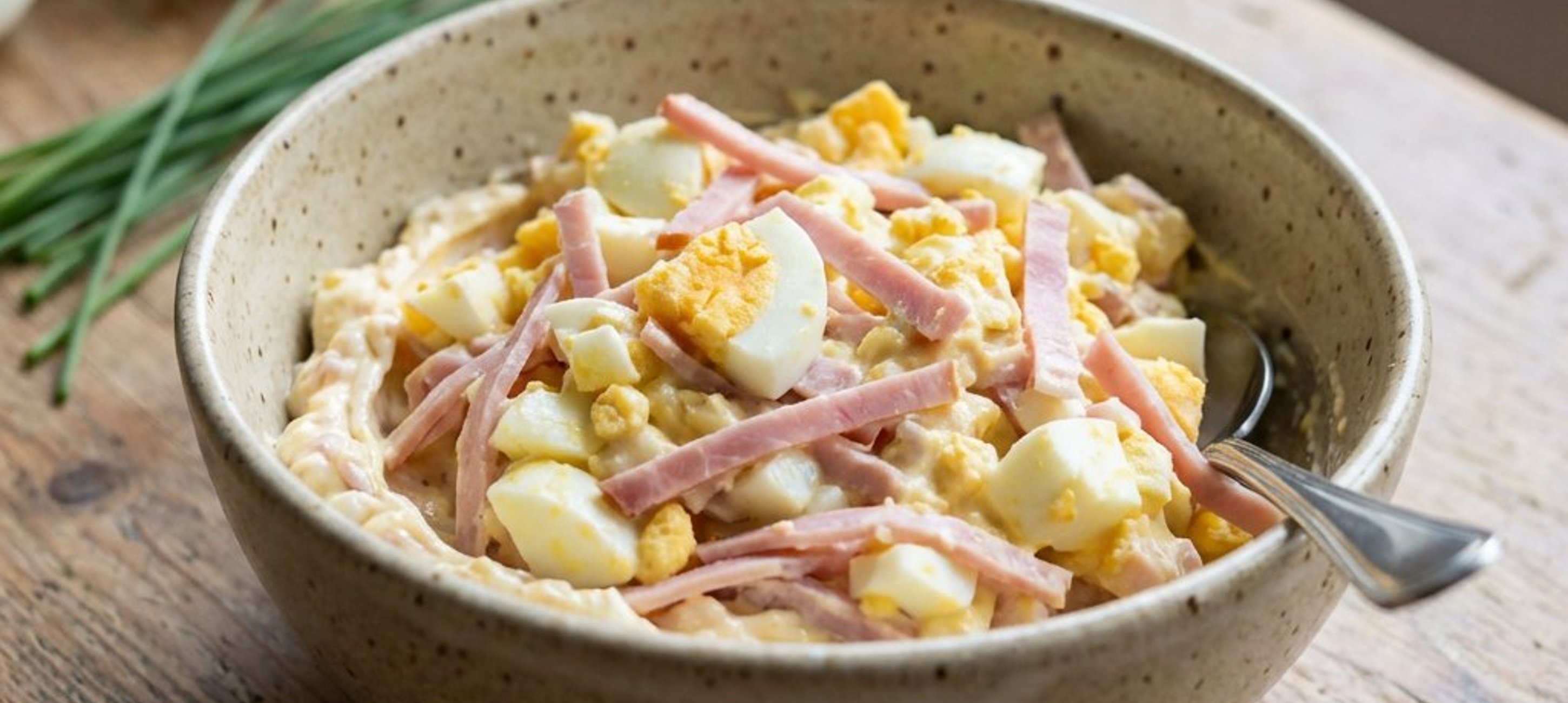 - 3In einer Schüssel die Eierwürfel, Schinkenstreifen, Frischkäse und Mayonnaise vermengen. Mit Salz und Pfeffer abschmecken. Die Mischung leicht mit einer Gabel zerdrücken, bis die gewünschte Konsistenz erreicht ist.