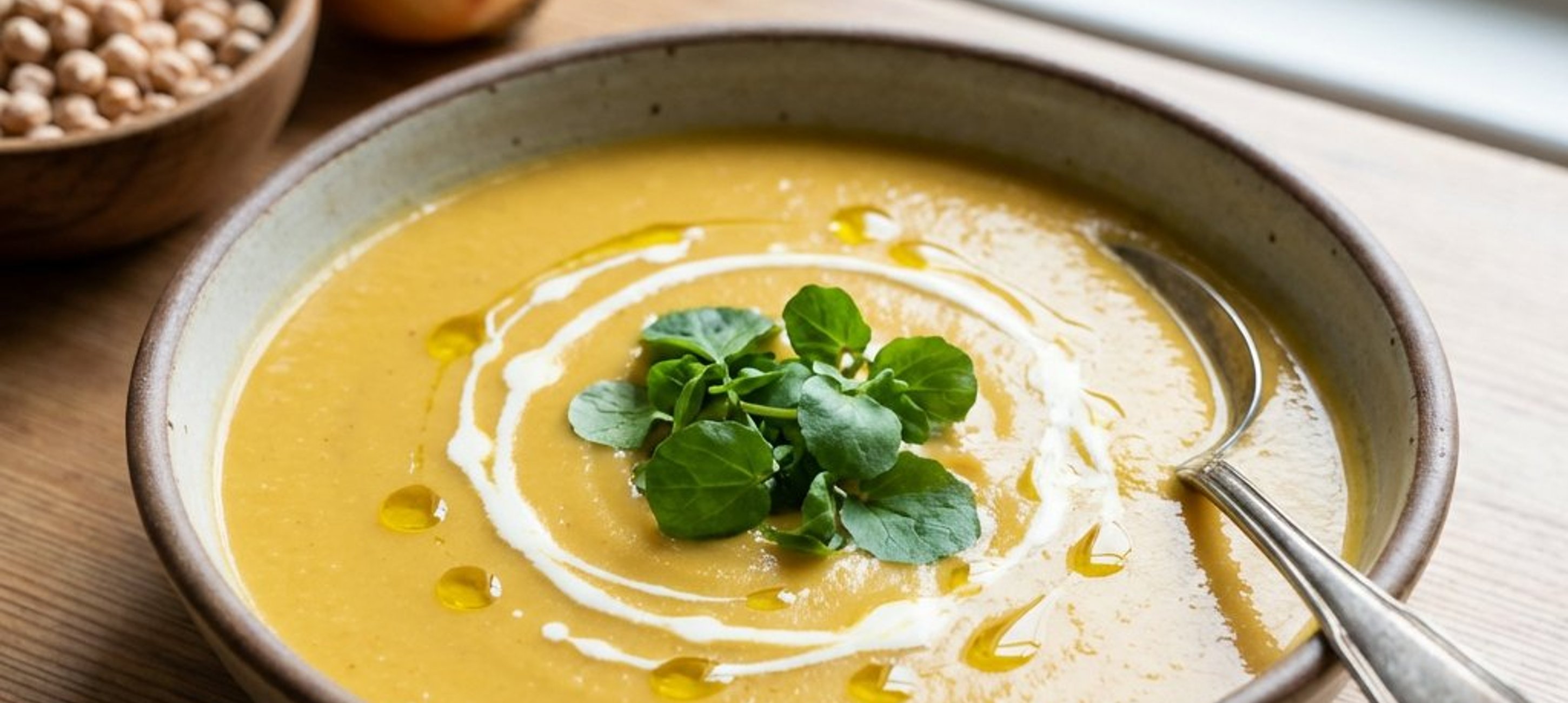 - 1In einem mittelgroßen Topf 2 EL Olivenöl bei mittlerer Hitze erhitzen. Die abgetropften Kichererbsen und die Zwiebelwürfel hinzufügen und unter gelegentlichem Rühren 3–4 Minuten anbraten. Den Knoblauch, Currypulver, Paprikapulver, Kreuzkümmel und die Butter in den Topf geben und alles weitere 1–2 Minuten mitrösten. Mit der Gemüsebrühe aufgießen, mit Salz and Pfeffer würzen und die Suppe ca. 13–14 Minuten bei mittlerer Hitze köcheln lassen.