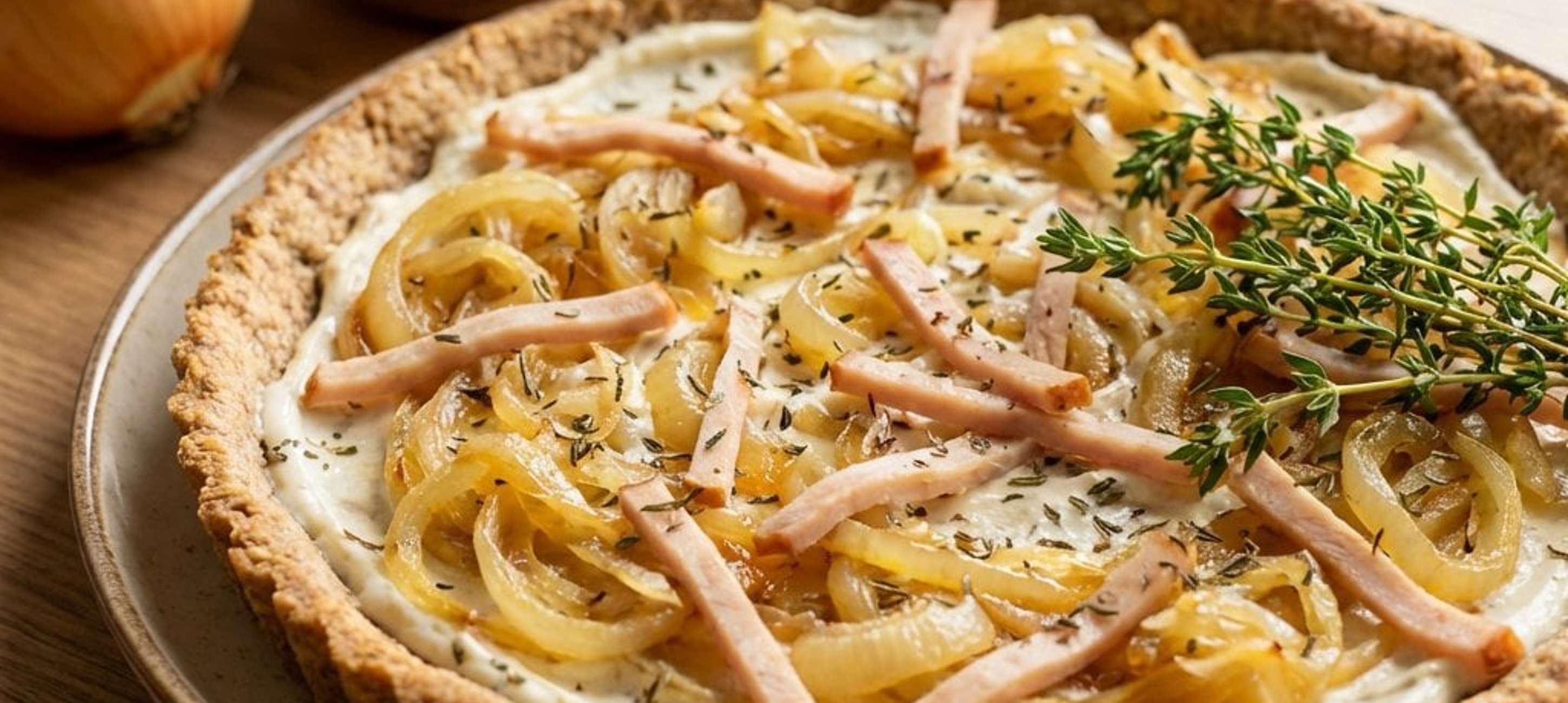 - 3Sobald die Zwiebelmischung fertig ist, die Pfanne vom Herd nehmen. Die Arbeitsfläche mit dem restlichen Mehl (20 g) bestäuben und den Teig ca. 1 cm dick ausrollen. Den Teig auf das Backblech legen, mit den restlichen 70 g Joghurt bestreichen und die Zwiebel-Schinken-Mischung gleichmäßig darauf verteilen. Den Kuchen im Ofen bei 180–185 °C ca. 30–35 Minuten goldbraun backen.