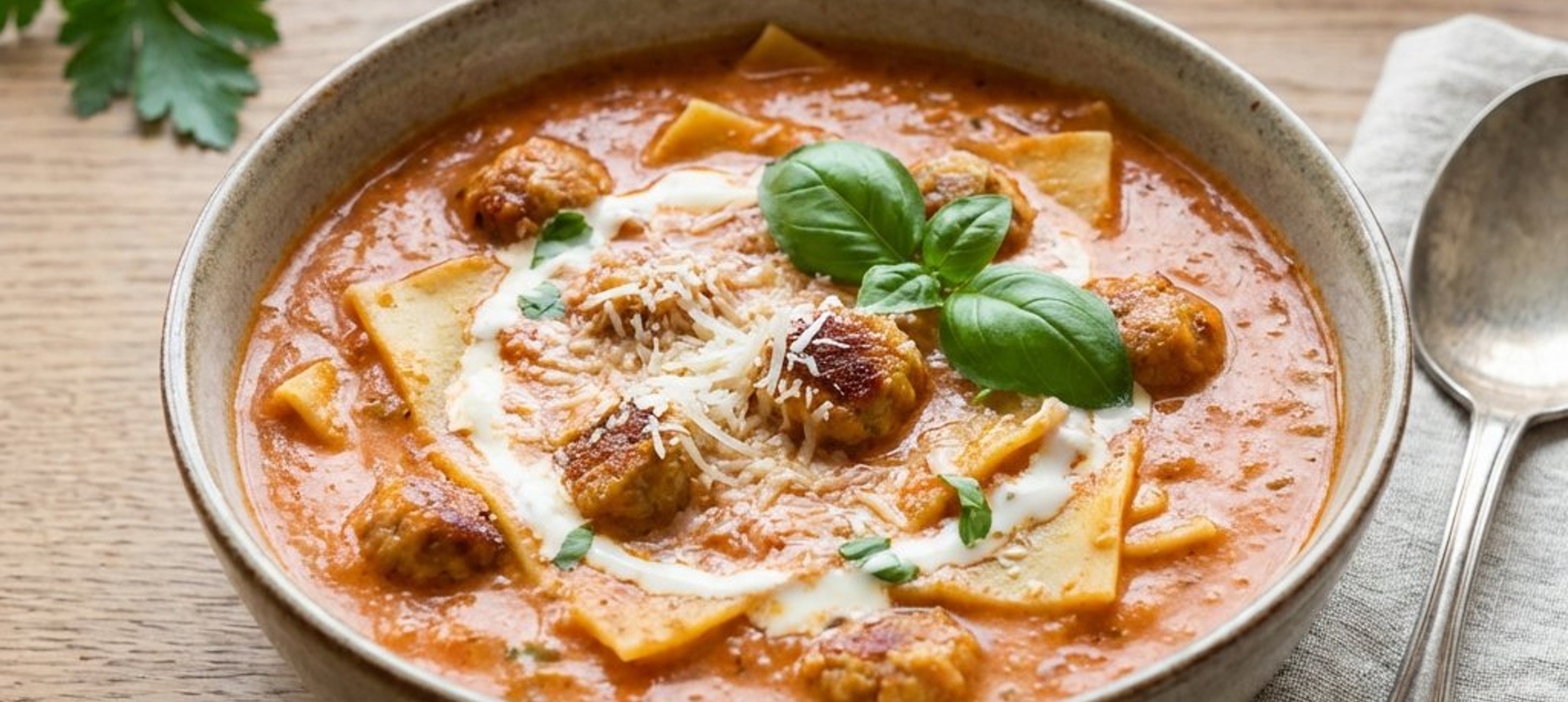 - 1Die Suppe in tiefen Tellern anrichten. Die Lasagnestreifen und die gebackenen Fleischbällchen hineingeben. Mit der fein gehackten Chilischote, dem restlichen Basilikum und dem restlichen Parmesan garniert servieren.