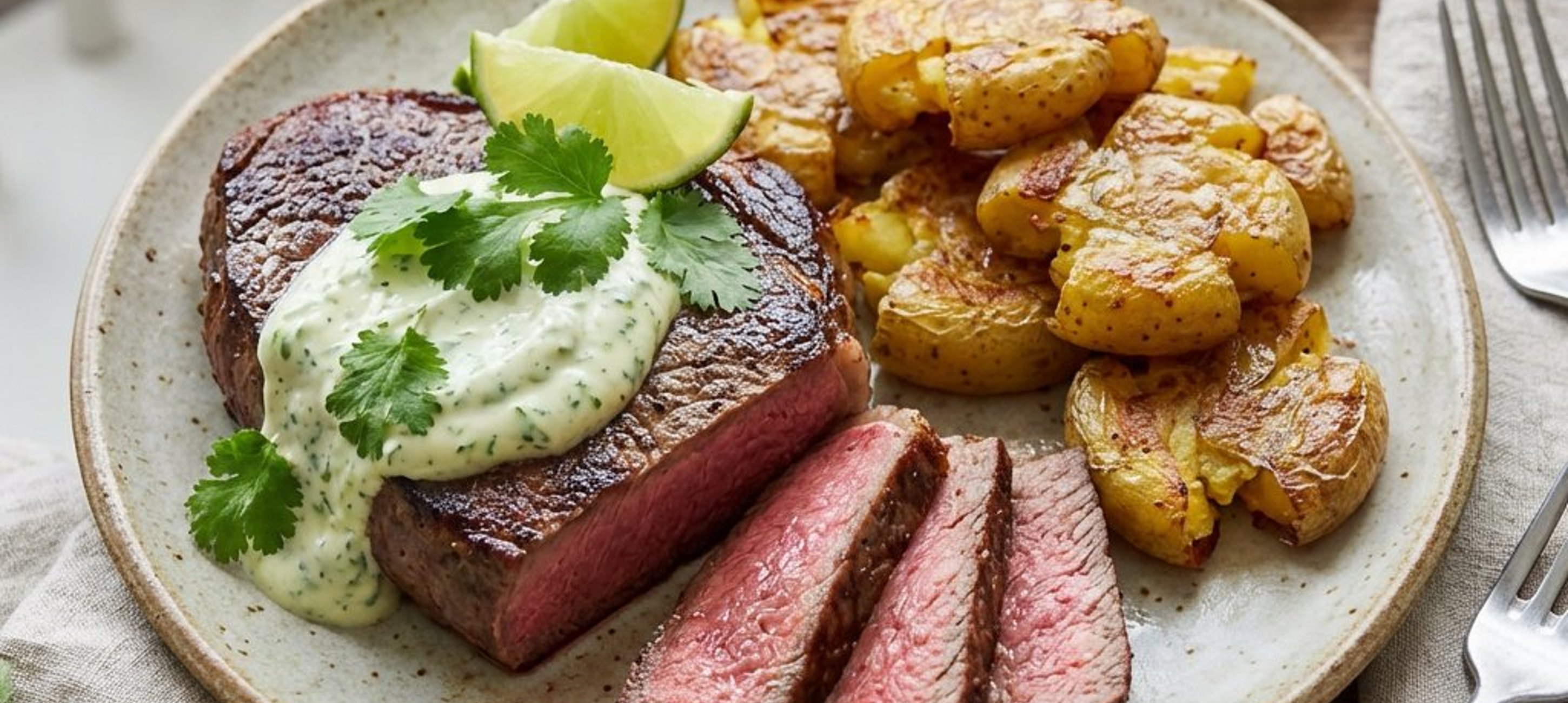 - 3Währenddessen die Mayonnaise mit Limettensaft, einer gepressten Knoblauchzehe und gehacktem Koriander glatt rühren. Die Steaks in Tranchen schneiden oder im Ganzen mit den Kartoffeln und dem Dip servieren.