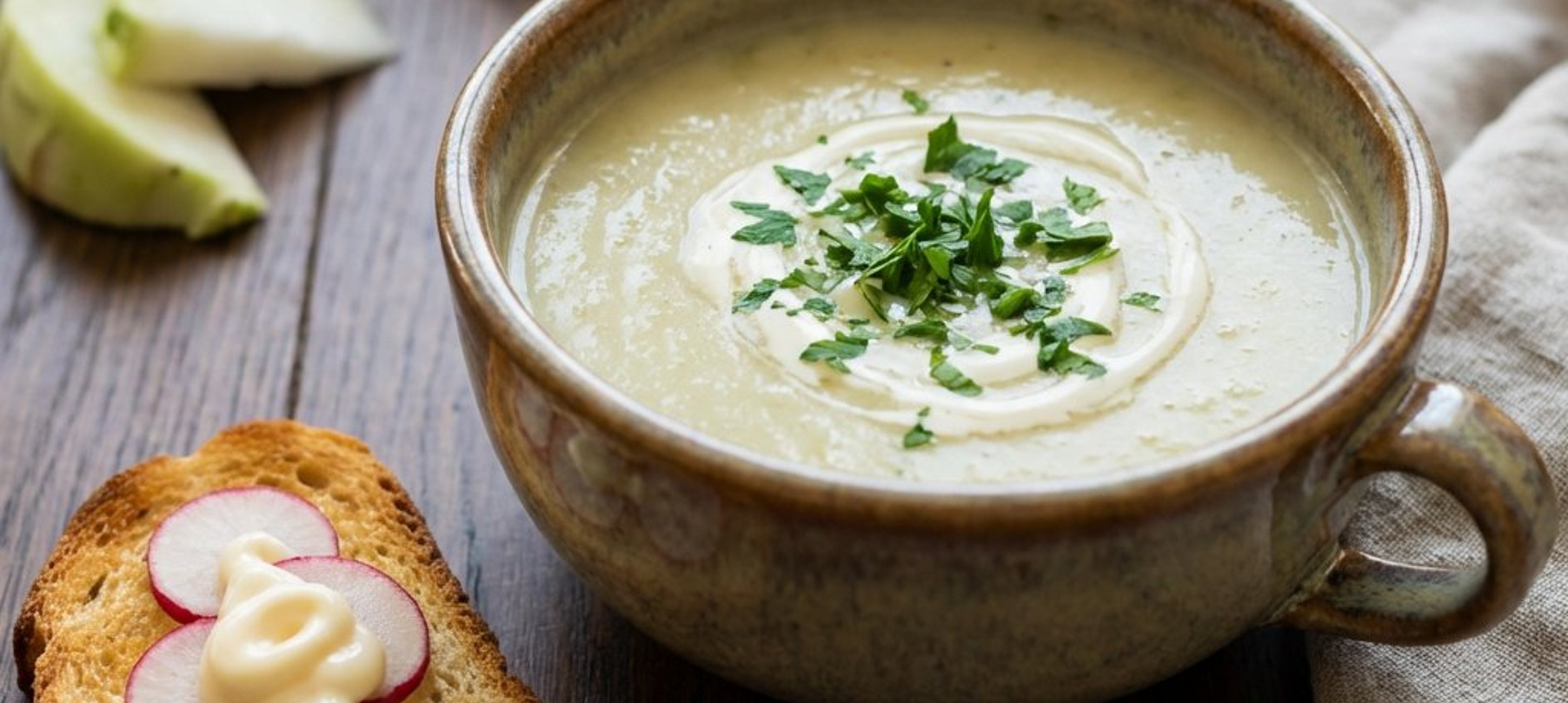 - 4Die Suppe in tiefen Tellern anrichten und zusammen mit dem Radieschen-Toast servieren.