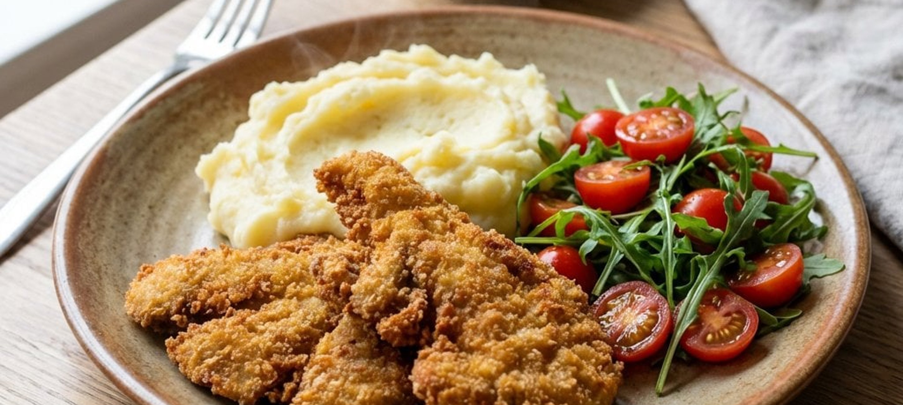 - 2Die fertigen Austernpilz-Schnitzel zusammen mit dem Kartoffelstampf und dem frischen Salat servieren. Guten Appetit!
