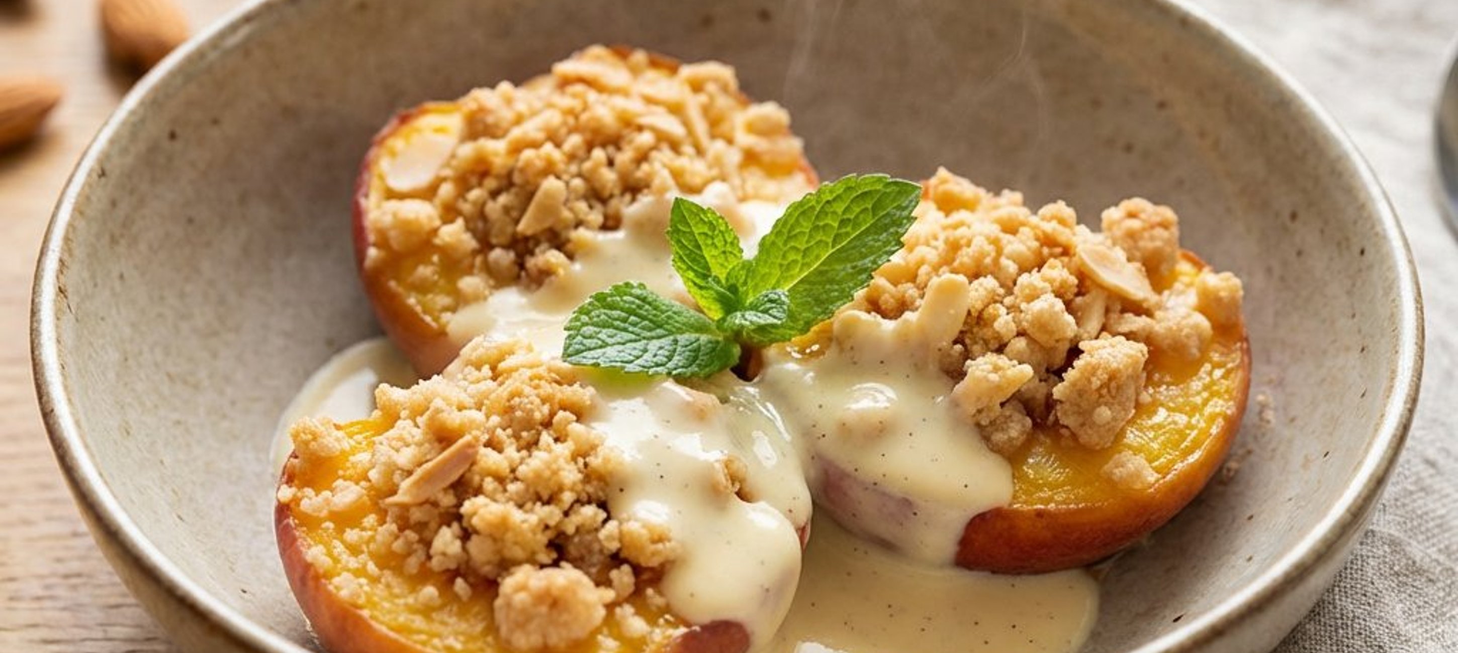 - 2Das Blech in den Ofen schieben und die Pfirsiche ca. 20–25 Minuten bei 170–180 °C backen, bis die Streusel goldbraun sind.