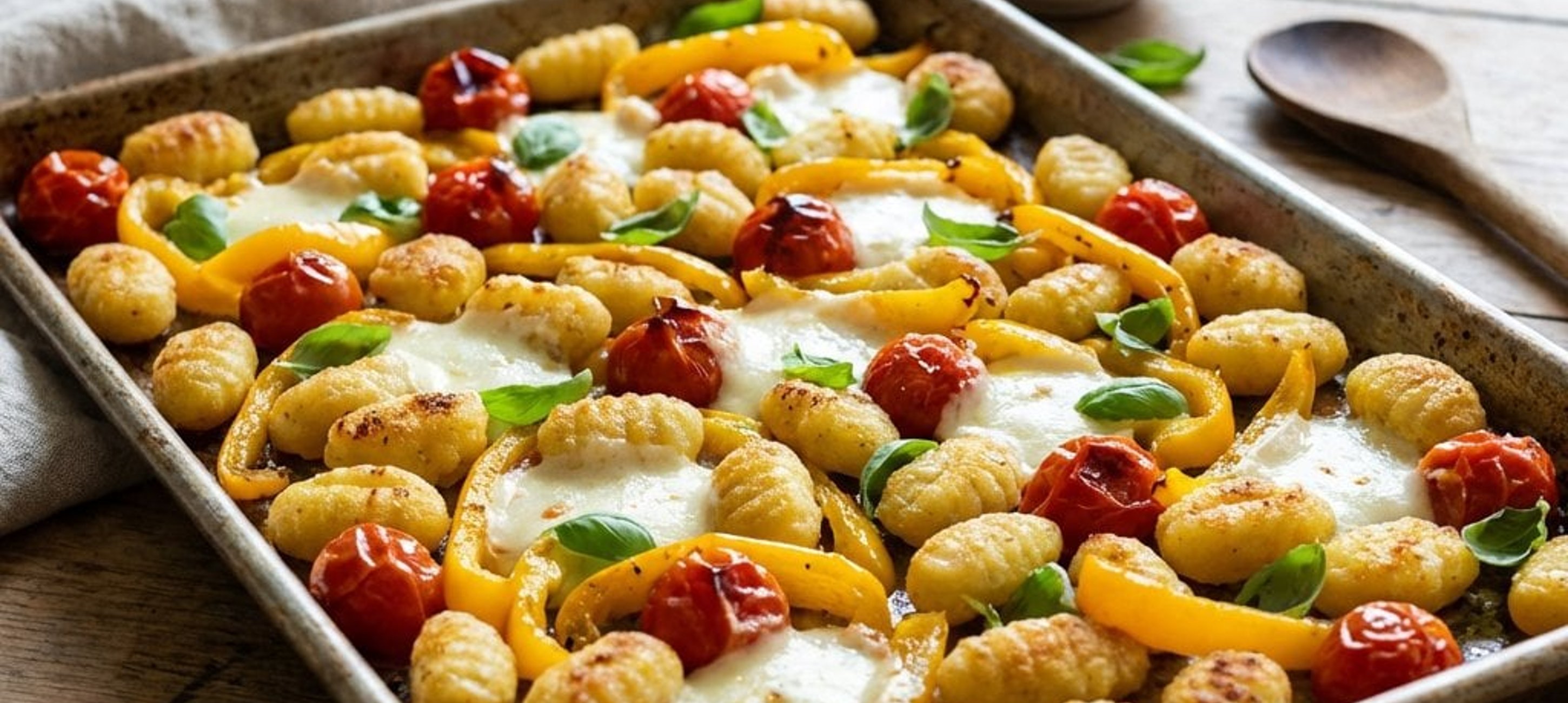 - 4Das Blech kurz herausnehmen. Den Mozzarella in grobe Stücke zupfen und über das Gemüse und die Gnocchi verteilen. Mit dem geriebenen Parmesan bestreuen und für weitere 1–2 Minuten in den Ofen schieben, bis der Käse geschmolzen ist. Sofort servieren.