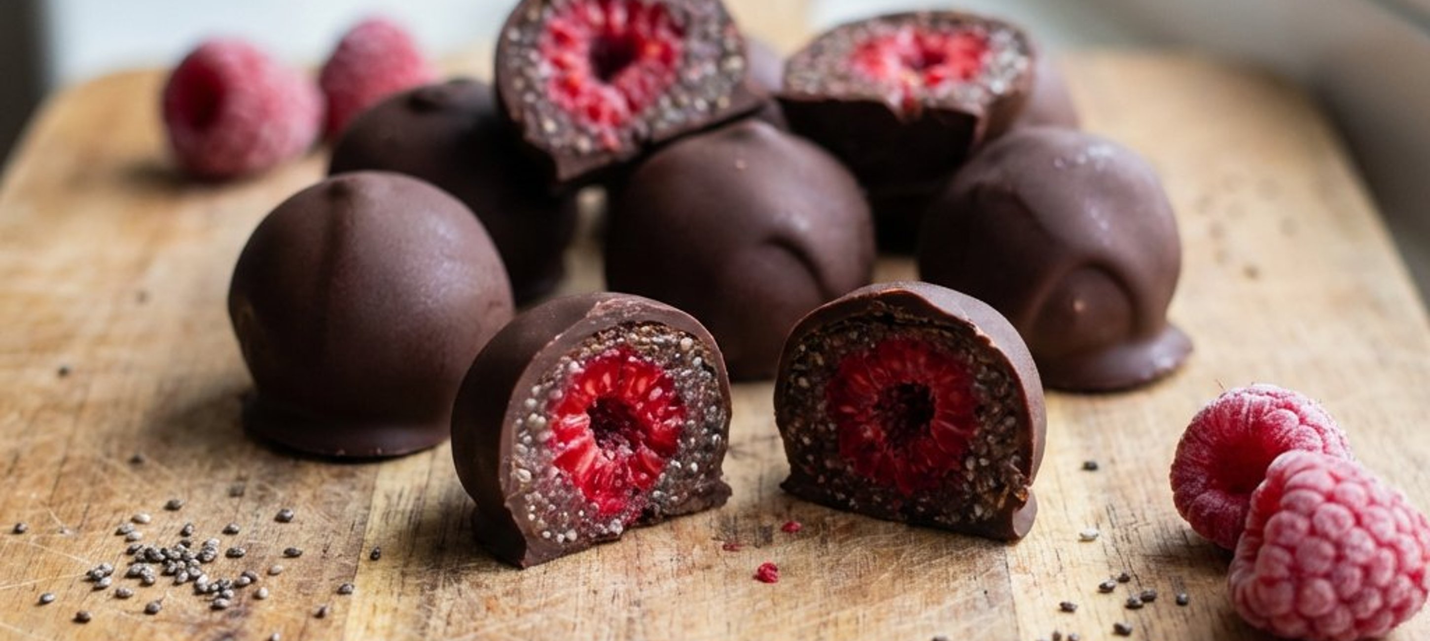- 2Die Schoko-Himbeeren für weitere 1–2 Minuten fest werden lassen (das geht bei den gefrorenen Kernen sehr schnell) und sofort genießen oder im Kühlschrank aufbewahren.