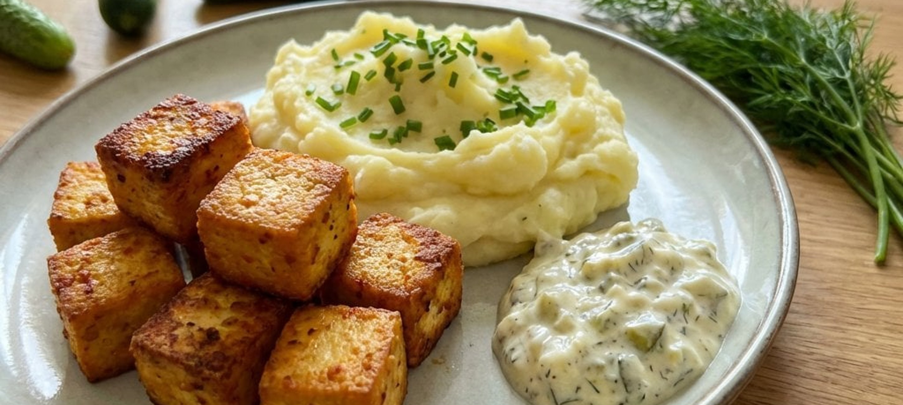 - 1Verteilen Sie das Kartoffelpüree auf Teller, geben Sie die gebratenen Linsentofu-Würfel darauf und servieren Sie das Gericht mit der gekühlten Sauce Tartare. Mit fein geschnittenen Lauchzwiebeln garnieren.