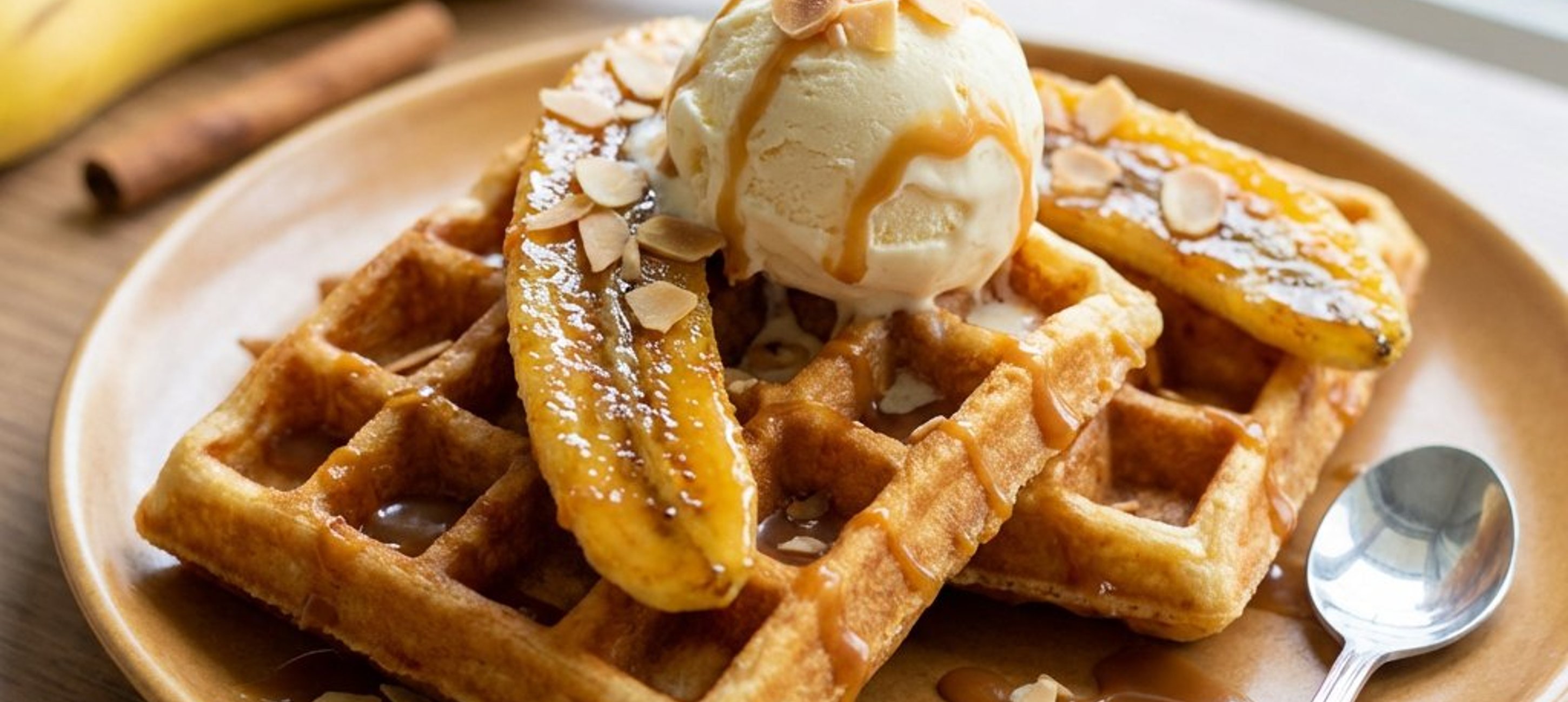 Servieren Sie die Waffeln sofort, solange die Bananen noch warm sind und das Eis gerade erst zu schmelzen beginnt – ein herrlicher Kontrast!
