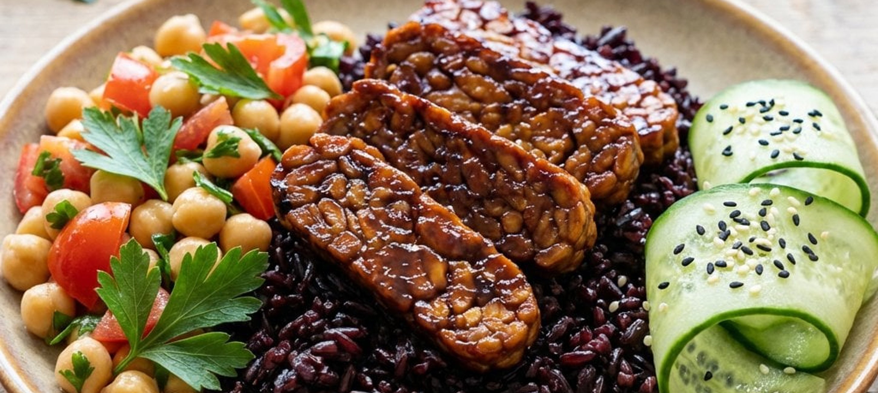 - 4Die Kichererbsen abspülen und abtropfen lassen. Mit 1 Esslöffel Olivenöl, fein gehackten Tomaten und gehackter Petersilie vermischen. Mit Salz und Pfeffer würzen. Die Gurke schälen und mit einem Sparschäler in feine Streifen schneiden. Mit Salz, Pfeffer und Sesamsamen bestreuen und zusammen mit dem Tempeh und Reis servieren.