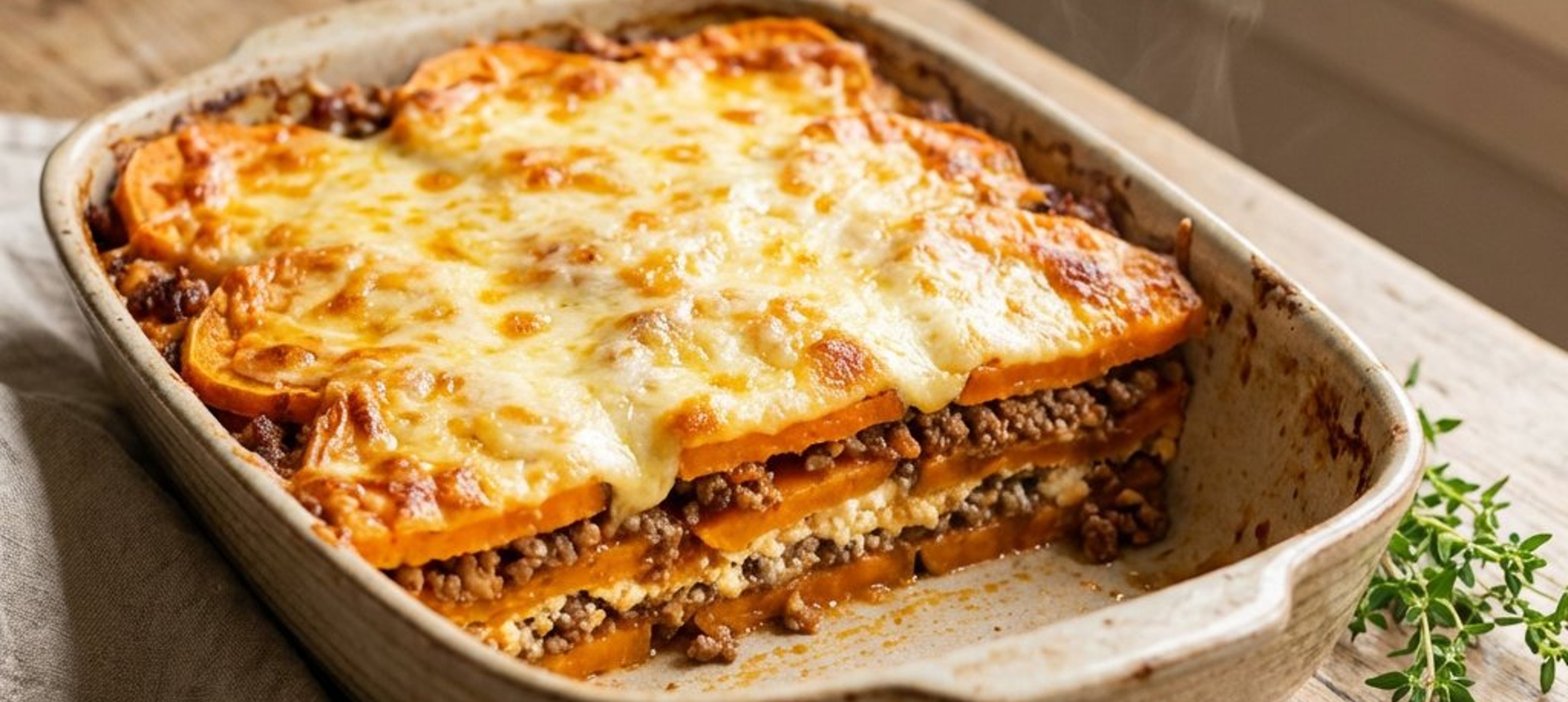 - 4Nun die Lasagne schichten: Den Boden der Auflaufform mit einer Schicht Süßkartoffelscheiben (ca. die Hälfte) auslegen. Darauf die Hälfte der Fleischsauce verteilen und mit der Hälfte der Hüttenkäse-Mischung bestreichen. Den Vorgang mit den restlichen Zutaten wiederholen. Die Lasagne im vorgeheizten Ofen bei 180–185 °C für ca. 45–50 Minuten goldbraun backen.