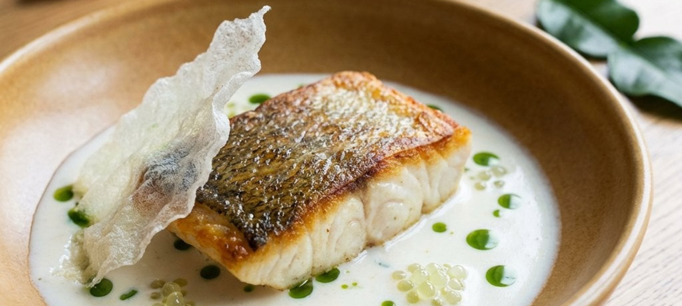 - 4Das Kabeljaufilet in die Mitte des Tellers legen. Die Sauce mit etwas Kräuteröl (optional) mischen, den Limettenkaviar (das Innere der Fingerlimetten) hinzufügen und die Sauce um den Fisch herum angießen. Mit einem knusprig frittierten Reispapier-Chip garnieren.