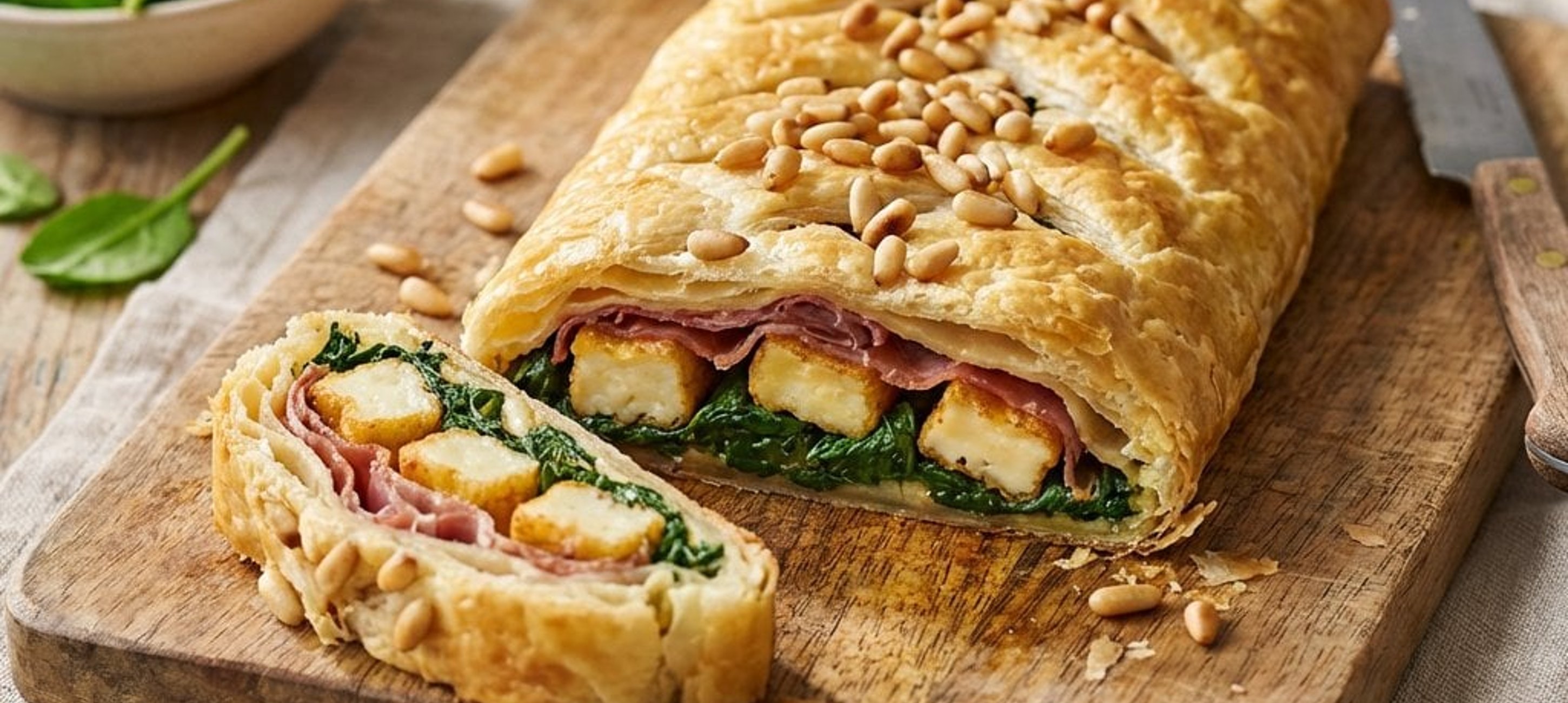 - 3Den Babyspinat auf dem mittleren Streifen verteilen, leicht salzen und pfeffern. Den Halloumi in kleine Würfel schneiden und in einer Pfanne kurz scharf anbraten, bis er goldbraun ist. Den Käse zusammen mit den Pinienkernen und dem Prosciutto Crudo auf dem Spinat verteilen.
