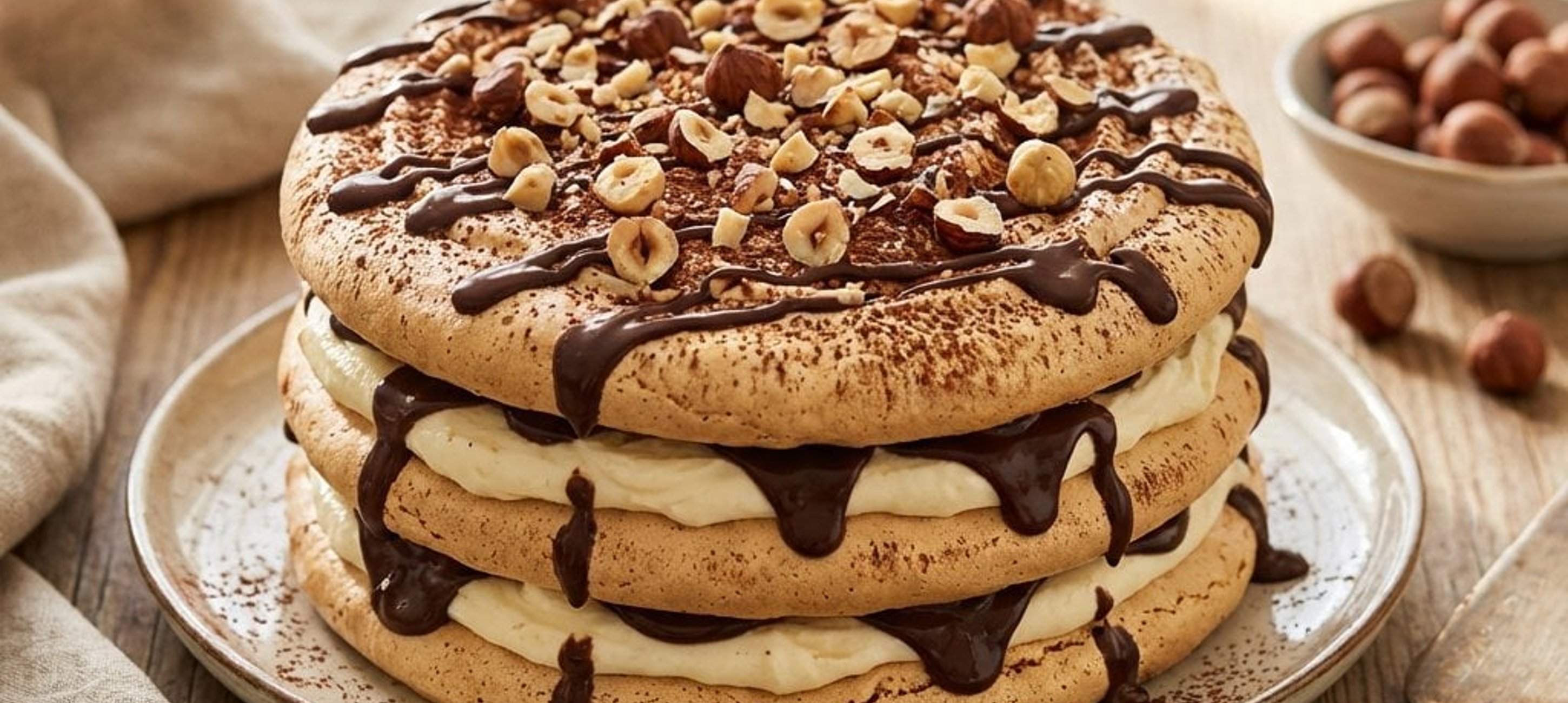 - 2Die Torte schichten: Einen Baiser-Boden auf eine Platte legen, mit einem Viertel der Creme bestreichen. Den nächsten Boden auflegen und so fortfahren, bis alle vier Böden und die Creme aufgebraucht sind. Die oberste Schicht mit Creme abschließen und nach Belieben mit Schokoraspeln verzieren. Vor dem Servieren mindestens 1 Stunde kühl stellen.