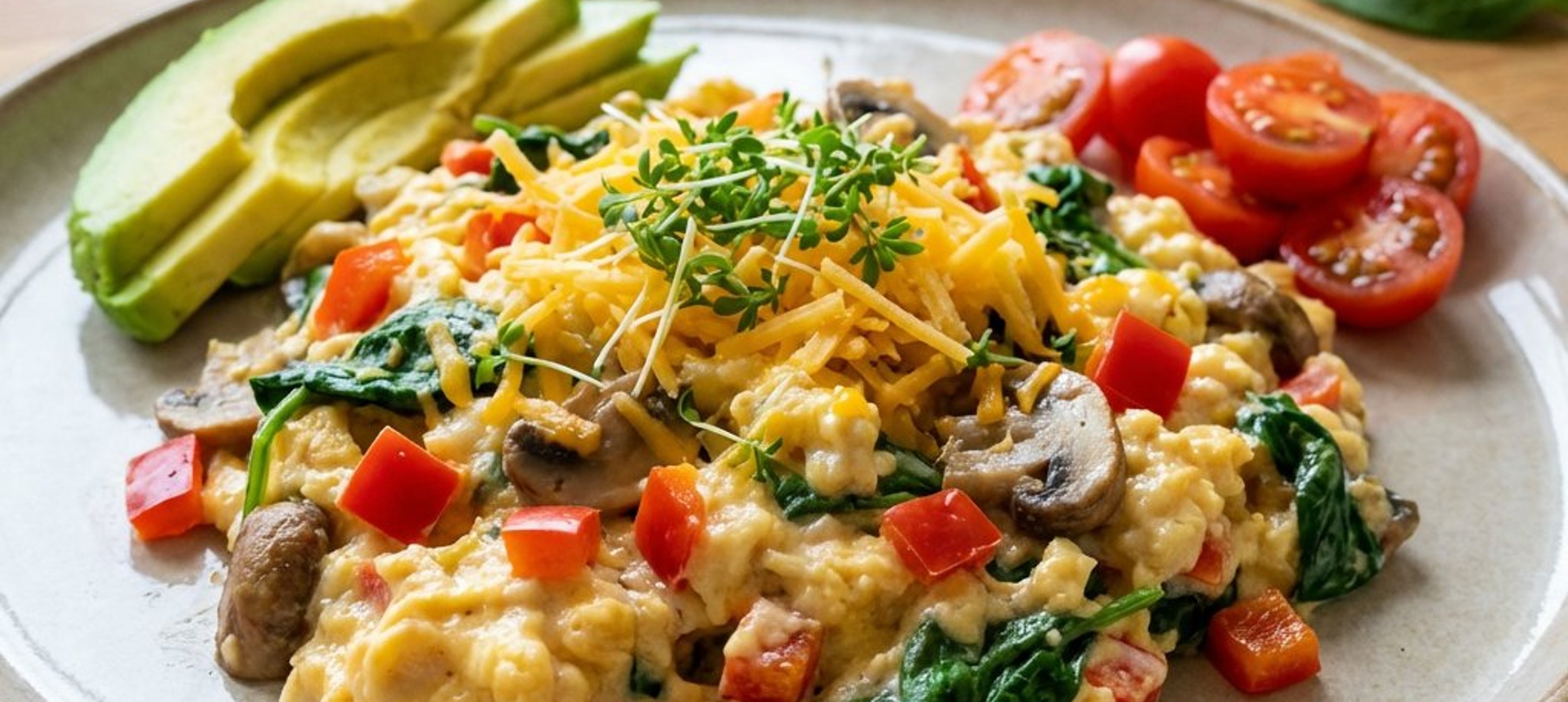 - 2Die Hitze auf niedrige Stufe reduzieren. Die verquirlten Eier, den Spinat und den geriebenen Cheddar in die Pfanne geben. Unter ständigem Rühren 2–4 Minuten stocken lassen, bis die gewünschte Konsistenz erreicht ist.
