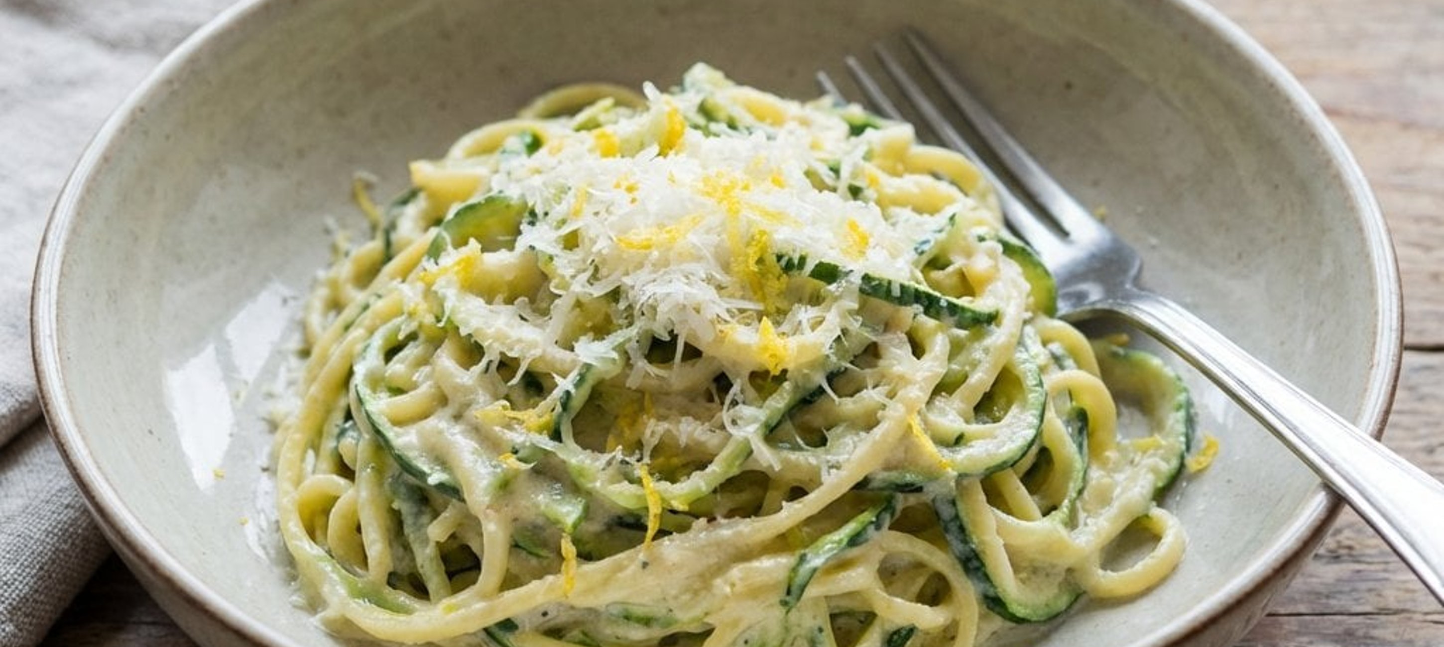 - 4Eine Pfanne bei mittlerer Hitze erhitzen und 2 EL Rapsöl darin heiß werden lassen. Die gewürfelte Zwiebel, den Knoblauch und die Zucchiniwürfel hinzufügen und ca. 2 Minuten anbraten. Danach 100–200 ml des aufgefangenen Nudelwassers hinzufügen, um die Sauce geschmeidig zu machen. Die Zucchinistreifen, Sojasahne, Zitronenabrieb, Salz und Pfeffer unterrühren und alles 1 Minute köcheln lassen. Zum Schluss die Spaghetti und die gehackte Petersilie unterheben und gut vermengen.