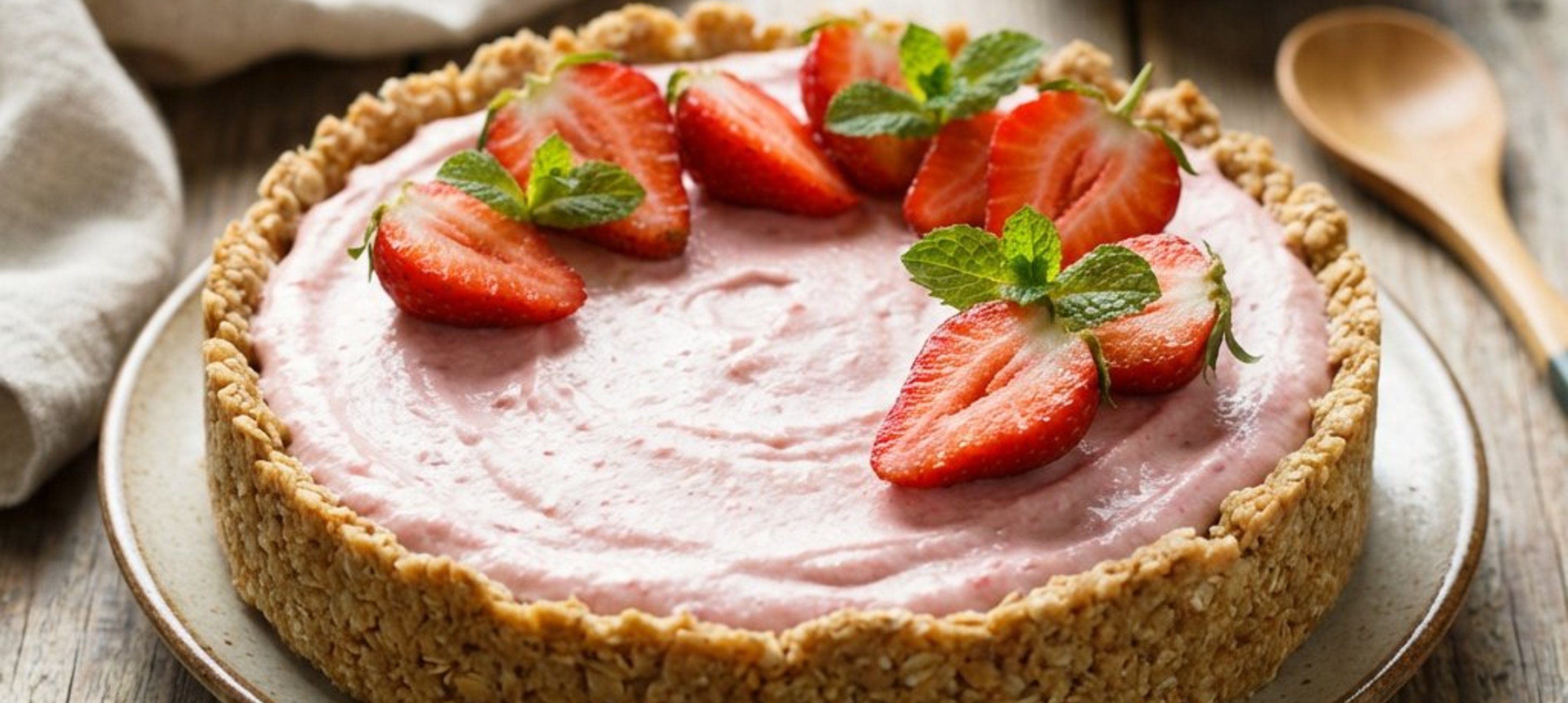 - 2Während die Gelatine quillt, bereiten Sie den Boden vor: Mischen Sie in einer mittelgroßen Schüssel die Haferflocken mit der Erdnussbutter und dem flüssigen Kokosöl. Verteilen Sie die Mischung auf dem Boden der Form und drücken Sie sie mit dem Boden eines Glases fest an. Waschen Sie die Erdbeeren, schneiden Sie sie in Hälften und legen Sie sie mit der Schnittseite nach außen am Rand der Form entlang aus. Die restlichen Erdbeeren für später im Kühlschrank aufbewahren. Stellen Sie die Form mit dem Boden ebenfalls in den Kühlschrank.