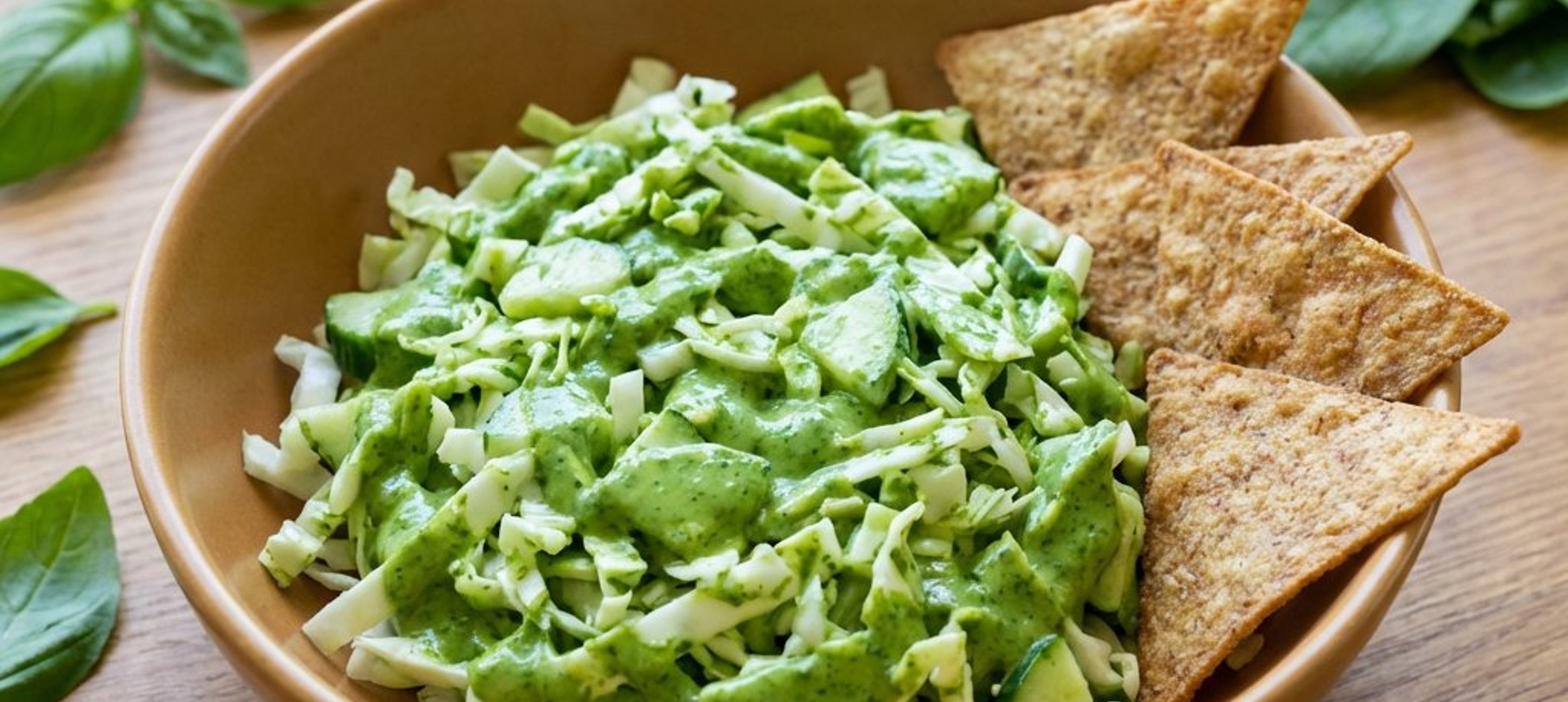 - 3Das grüne Dressing über den Kohl und die Gurke in die Schüssel gießen. Alles gut vermengen, bis das Gemüse gleichmäßig mit dem Dressing überzogen ist. Den Salat auf 4 Portionen verteilen und servieren.