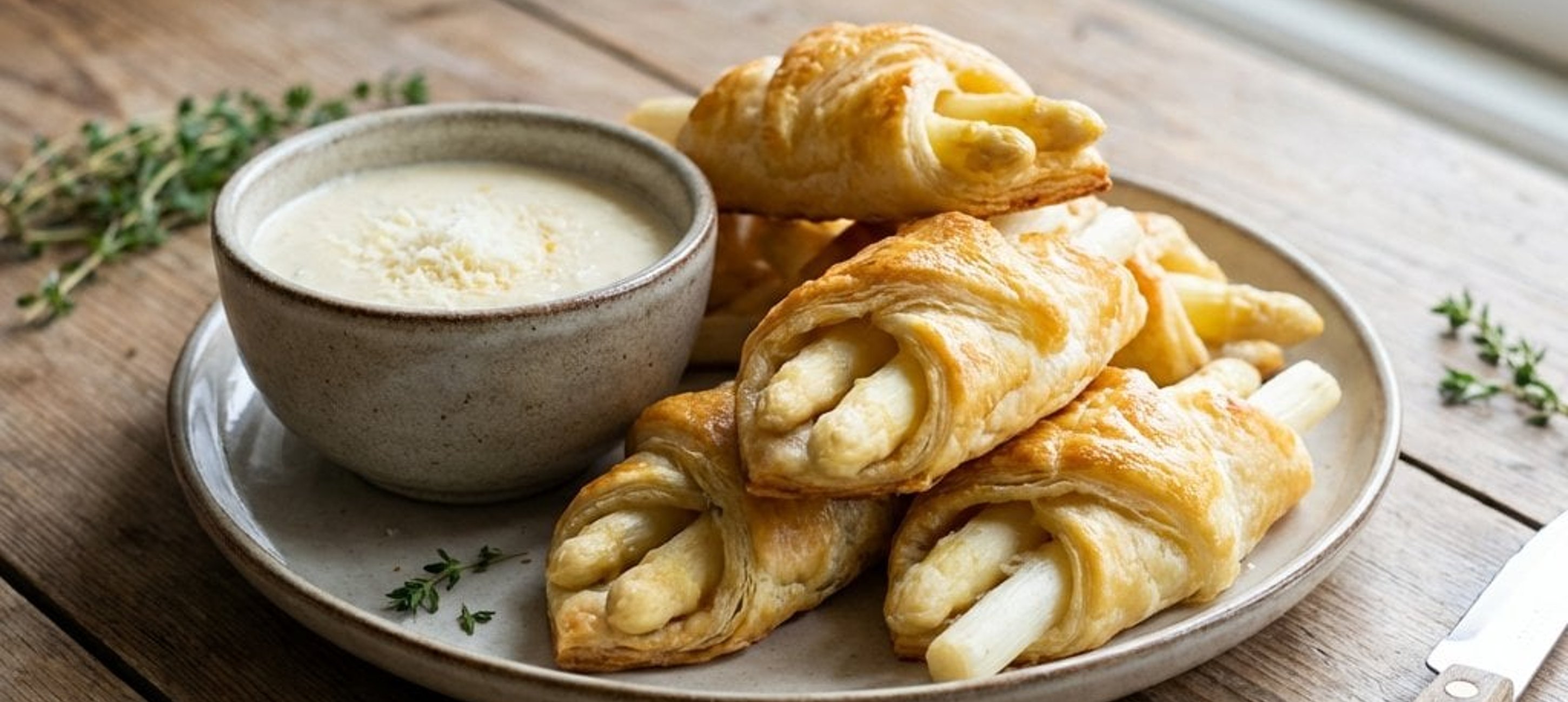 - 2Den frischen Blätterteig auf der Arbeitsfläche ausrollen (ca. 1-2 mm dick). In Rechtecke schneiden, die etwa dreimal so breit wie eine Spargelstange und 2-3 cm länger sind.