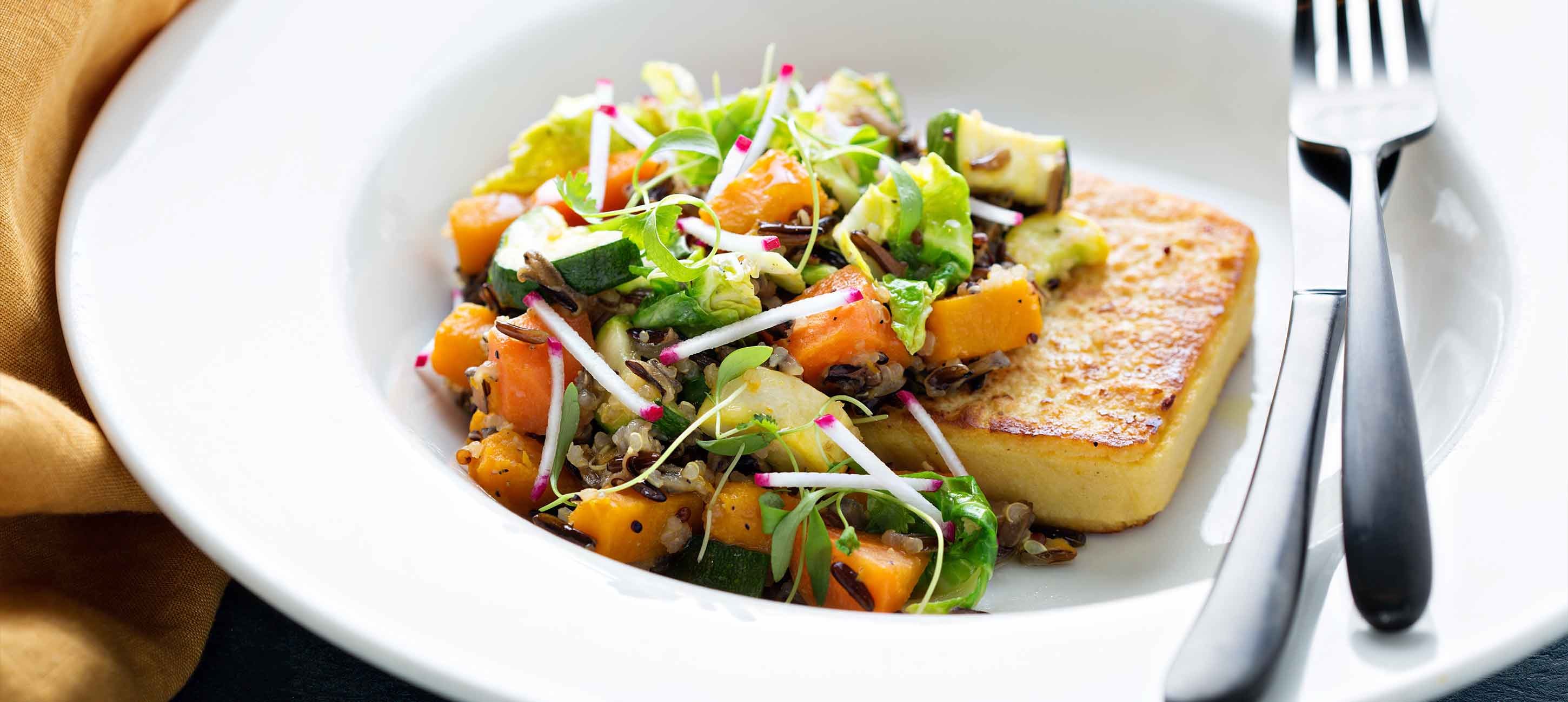 - 5Für die Polenta: bring pflanzliche Sahne und Gemüsebrühe in einem Topf zum Kochen. Füge unter ständigem Rühren den Maisgrieß (Polenta) hinzu und lass ihn je nach Packungsanweisung bei schwacher Hitze köcheln, bis der Grieß weich ist – dies kann je nach Polentasorte nur wenige Minuten oder auch 10 Minuten oder länger dauern. Schmecke die Polenta mit Hefeflocken, Salz und Pfeffer ab.