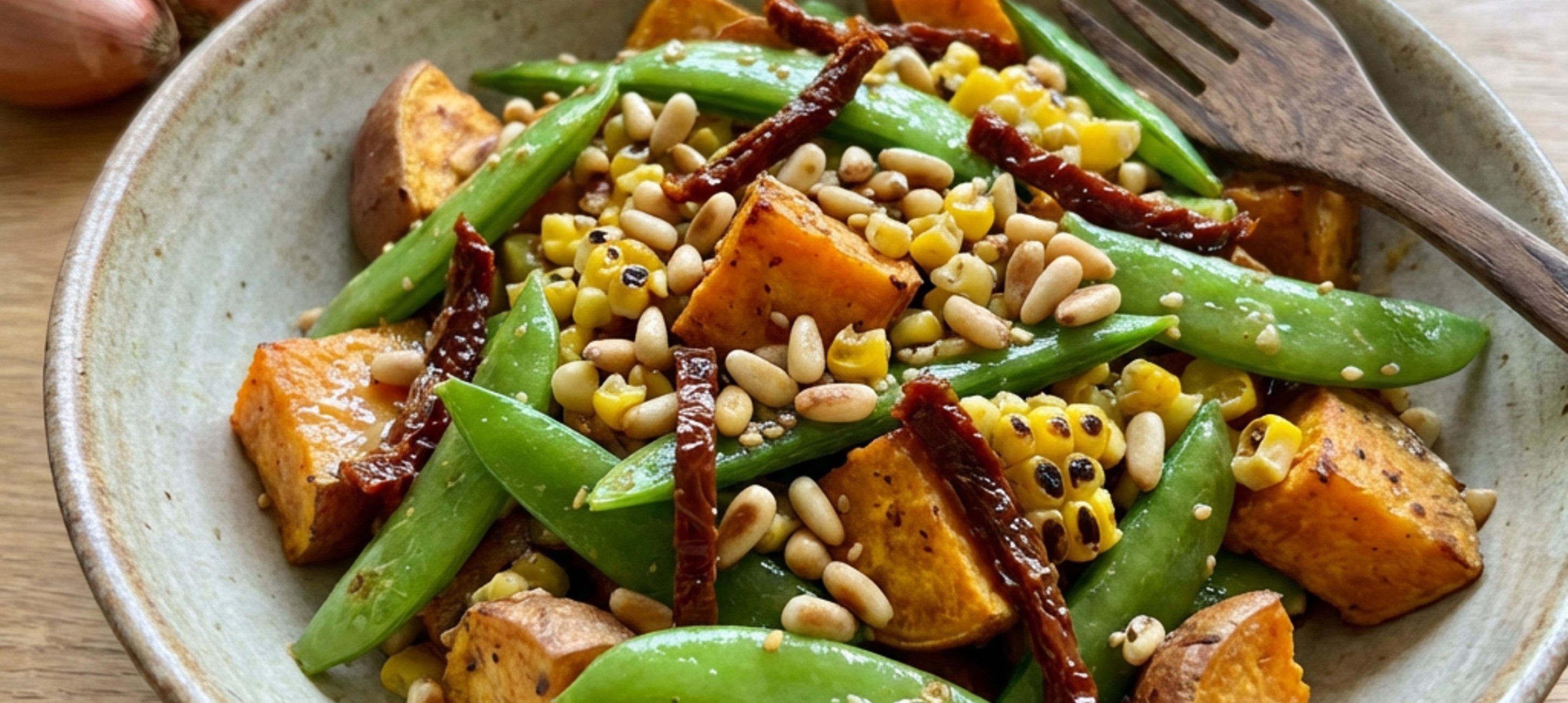 - 4Die gebackenen Süßkartoffeln und Zuckerschoten mit der Vinaigrette vermengen. Mit Pinienkernen, Mais und getrockneten Tomaten garnieren.