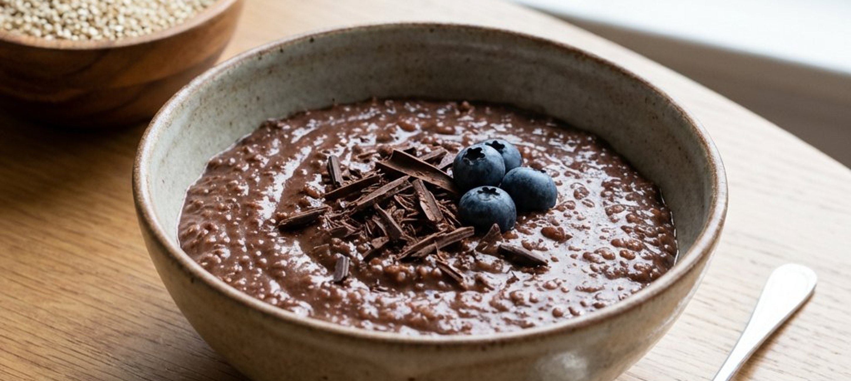 Garnieren Sie den Brei mit frischen Beeren (z. B. Heidelbeeren), einem Klecks Honig und nach Belieben mit frischen Minzblättern oder zusätzlichen Schokoraspeln.