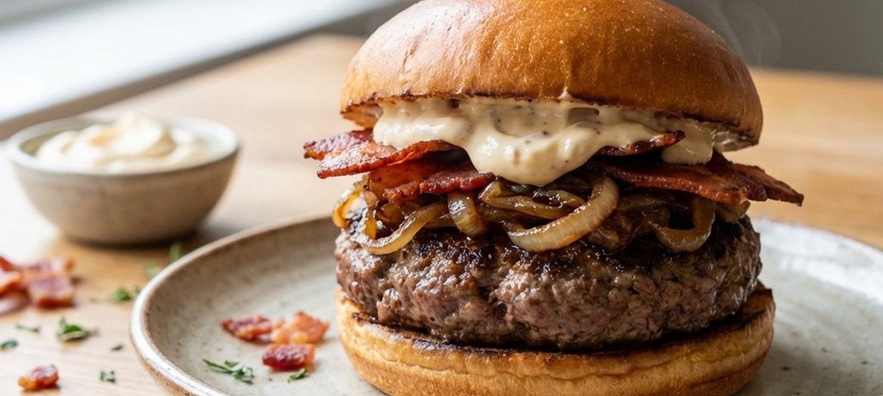 - 2Die Unterseite der Brötchen mit der geräucherten Mayonnaise bestreichen. Nacheinander Rucola, das Fleischpatty, die karamellisierten Zwiebeln, den Bacon und eine Scheibe Tomate darauf schichten. Mit der oberen Brötchenhälfte abdecken und sofort servieren.