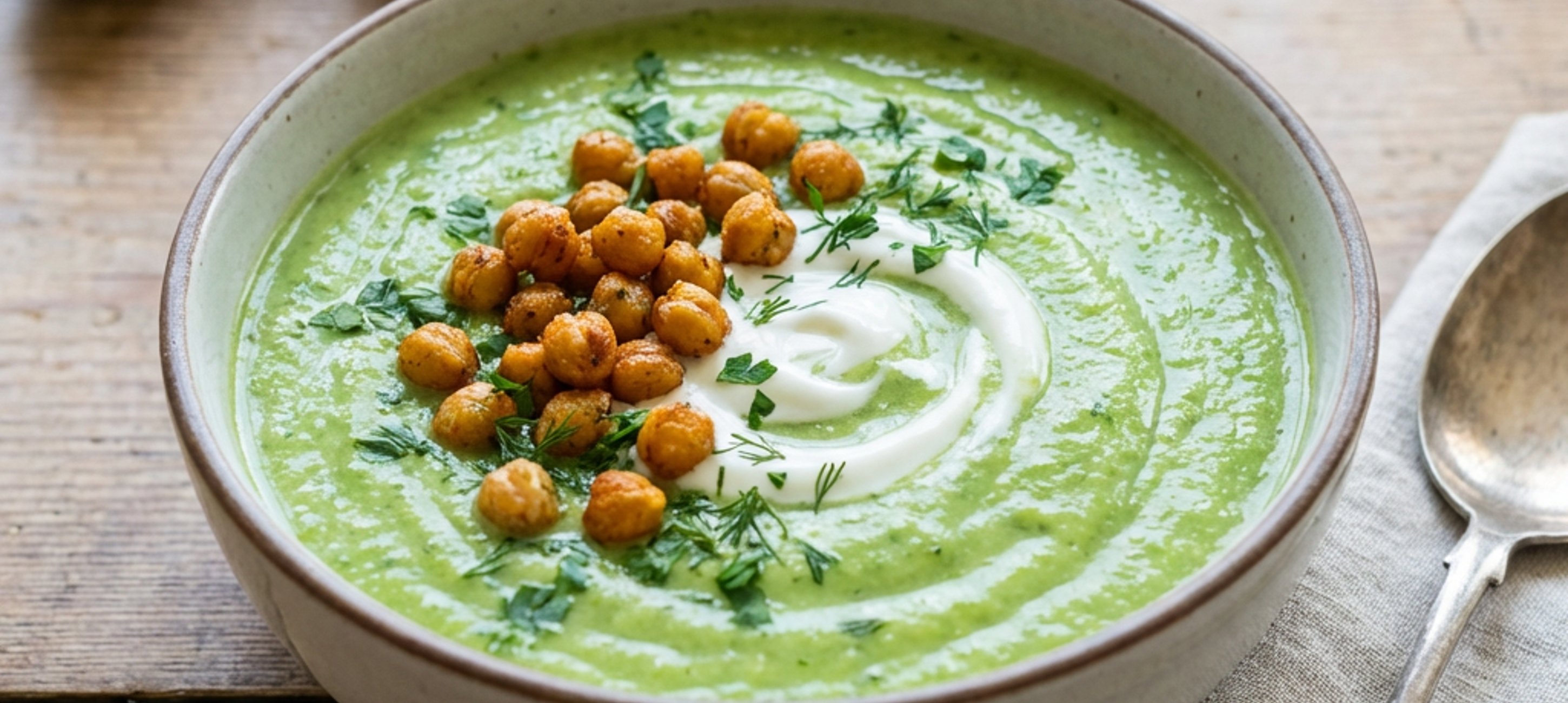 - 5Garniere die kalte Suppe mit den gerösteten Kichererbsen, pflanzlichem Joghurt, einem Schuss Öl und frischen Kräutern.