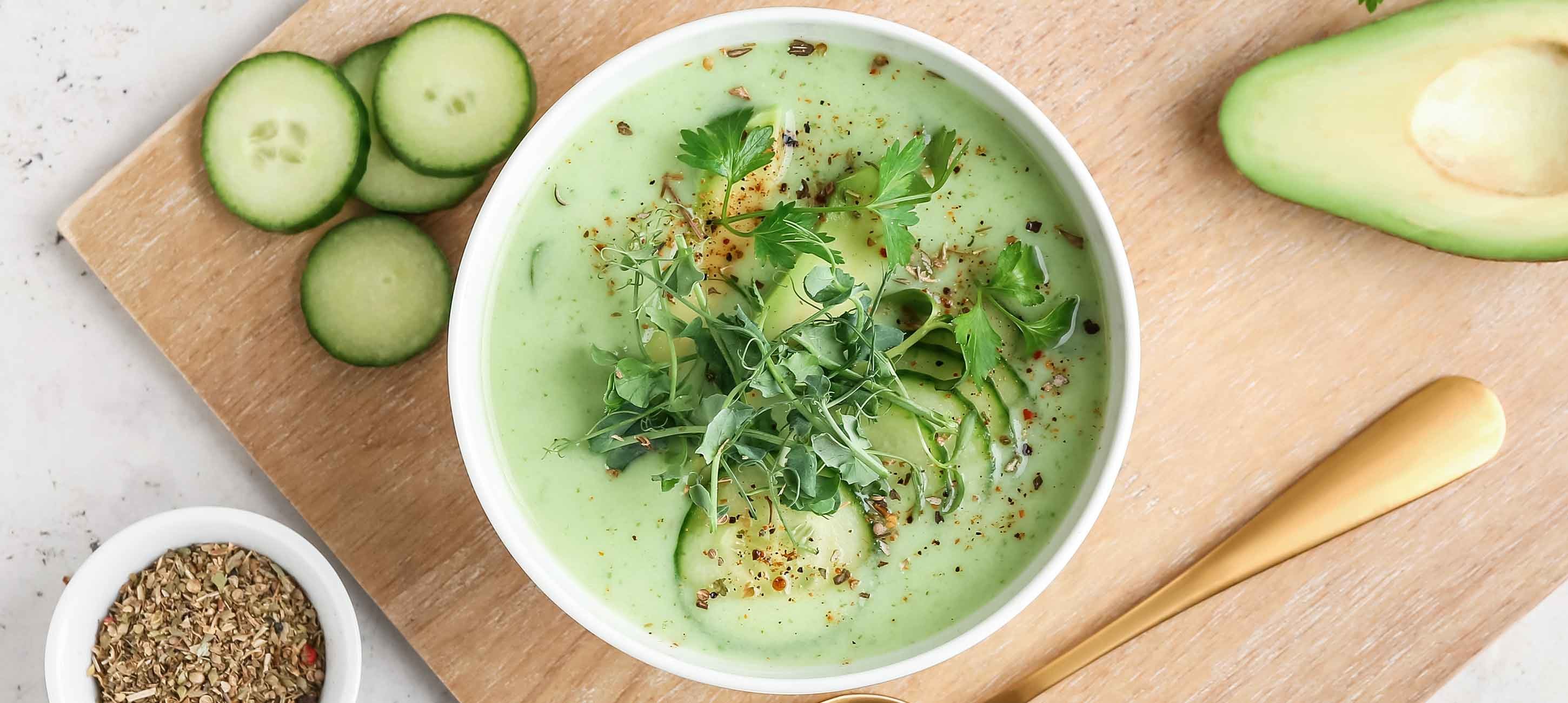 - 5Garniere die kalte Suppe mit den gerösteten Kichererbsen, pflanzlichem Joghurt, einem Schuss Öl und frischen Kräutern.